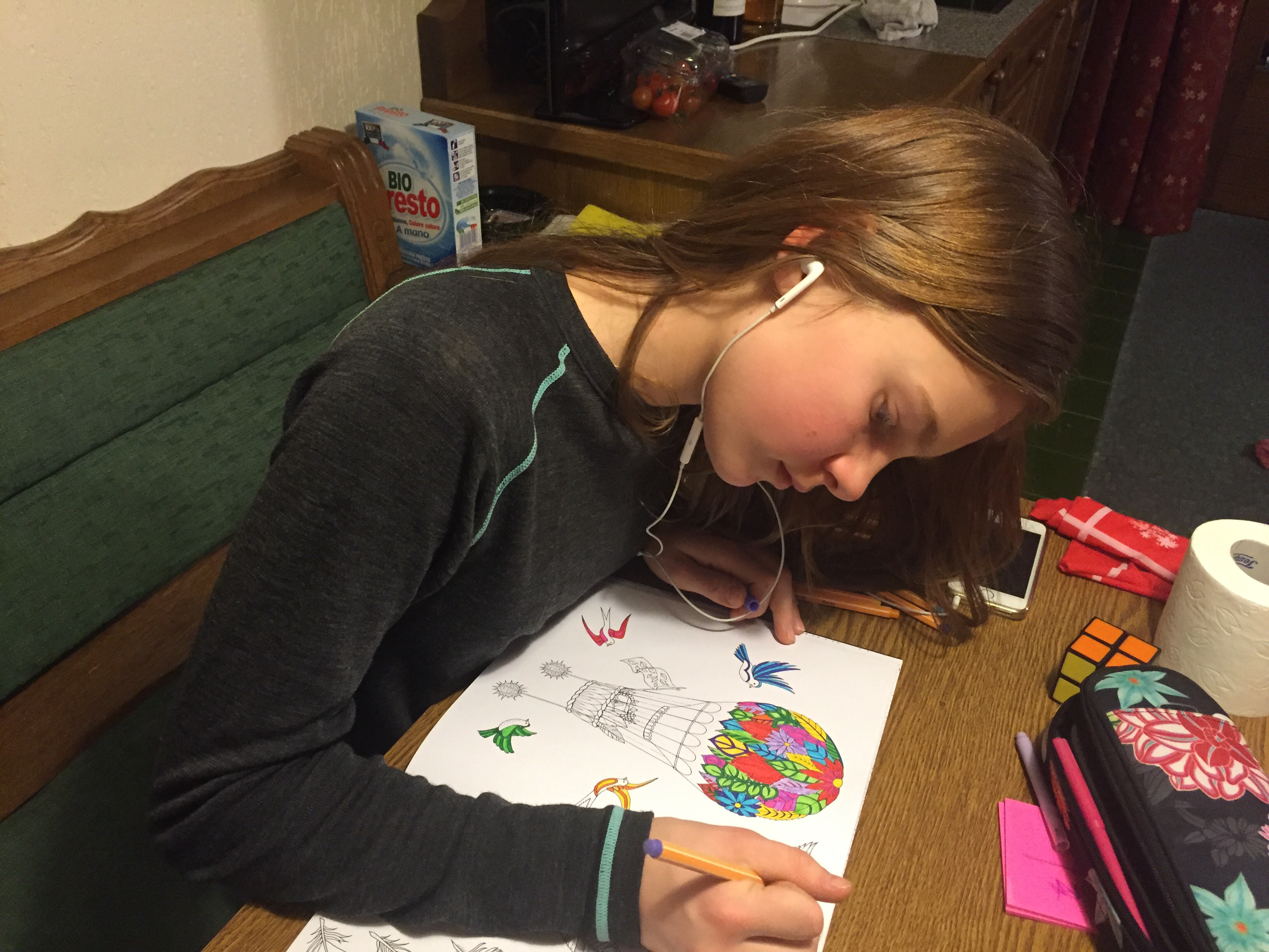 Jeg nåede lige en 6 km løbetur i god fart, før vi skulle spise. Her til aften er mændene og de yngste gået på fodboldbar for at se Champions Leage kampe. Liva og jeg spiller spil og farvelægger malebøger.