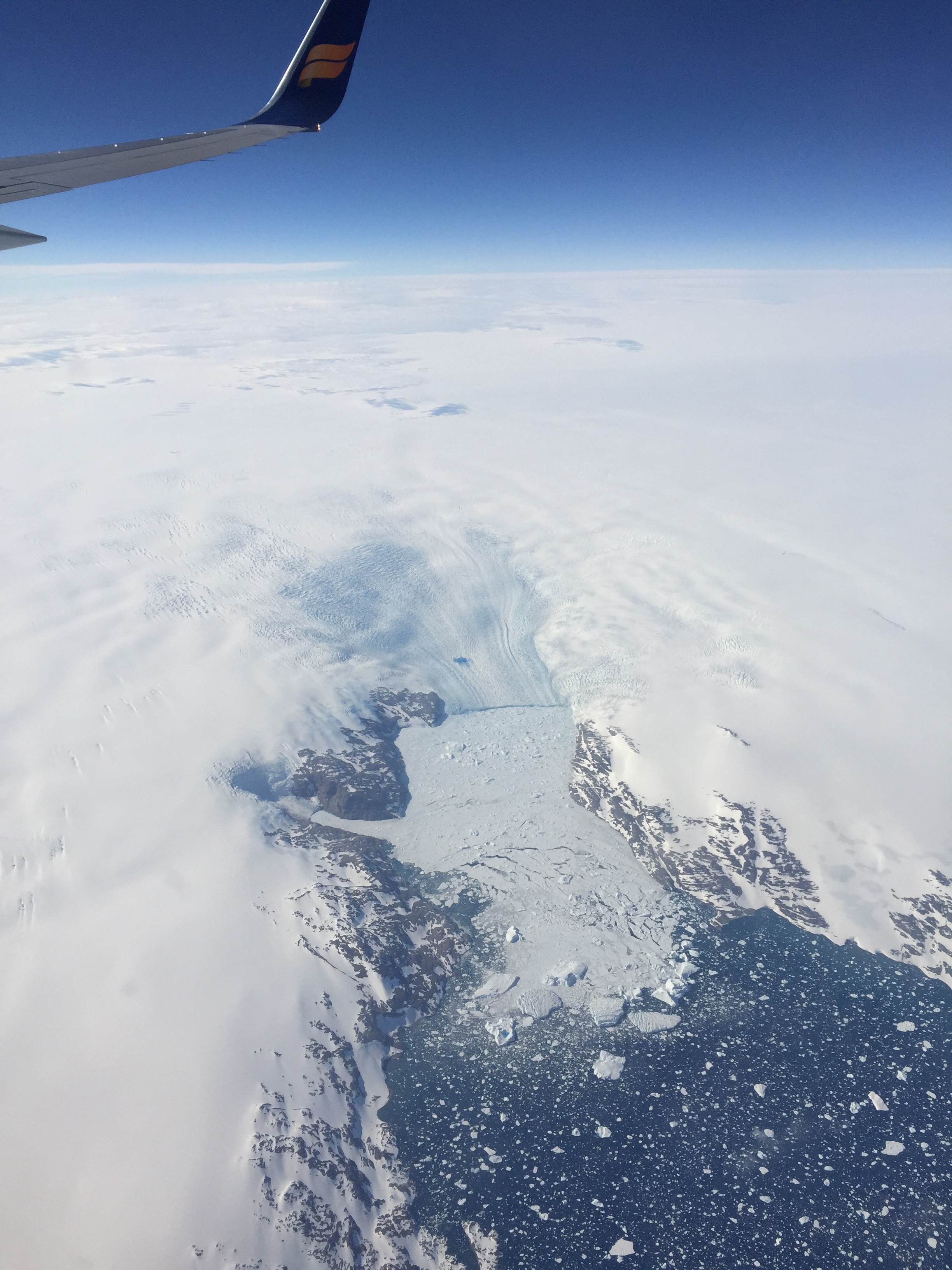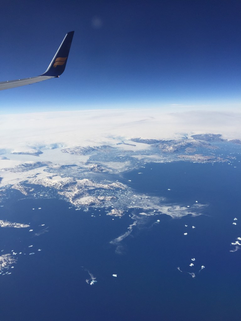 Turen ind over Grønland og indlandsisen var virkelig flot. Vi kunne se is “gletcher”, der munder ud i hav, isbjerge og drivis …