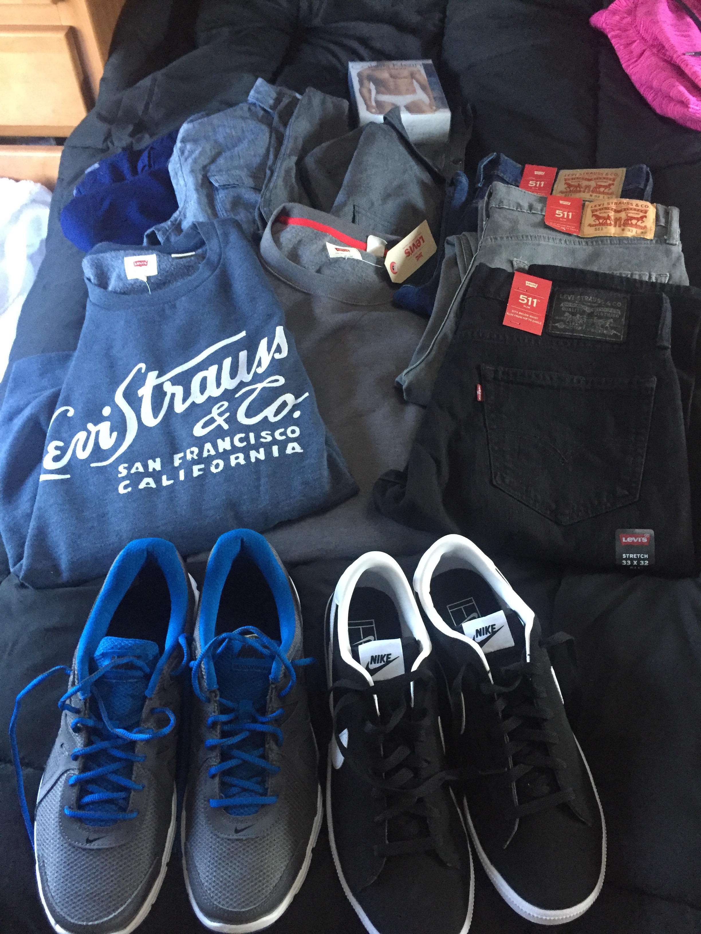 - Levis store: 3 par jeans og 2 trøjer til Mark, 3 bluser og 1 buks til Liva, hvide stumpe jeans og grå uldtrøje til Mia