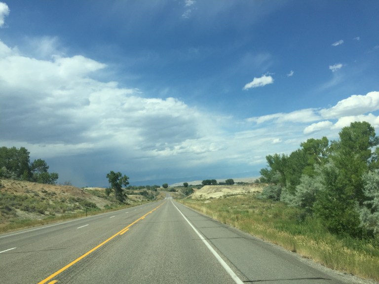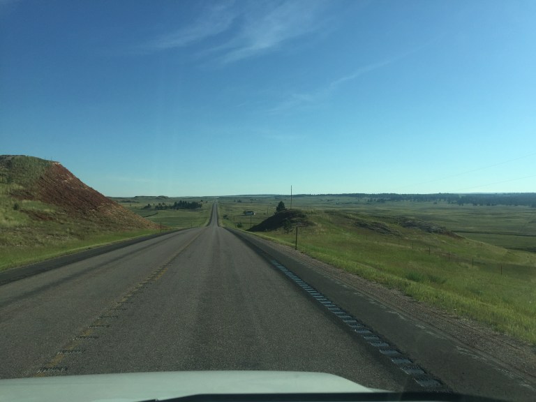 Fra Devils Tower, først af Interstate 90, dernæst hovedvej 16 op over Big Horn Mountains i 2950 m.
