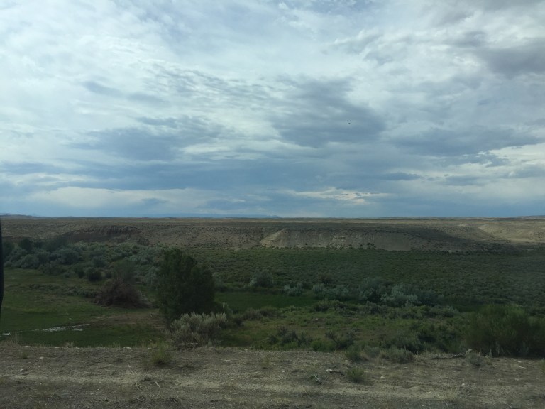 Det allersidste stræk var der kø- sikkert fordi en flok bisoner med kalve stod på vejen. Så træls at holde stillet bare få km fra campingpladsen efter knap 15 timer i bilen. Pigerne har været så dygtige – også i dag! Sovet lidt, læst lidt, sunget med på sange osv. Mark har kørt hele strækket i dag – over 3 bjergkæder!