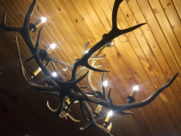 Efter en herlig burger på restaurant i aftes, spillede vi 5 Crowns og gik i seng, meget mætte! Der var en flot lysekrone:-)
