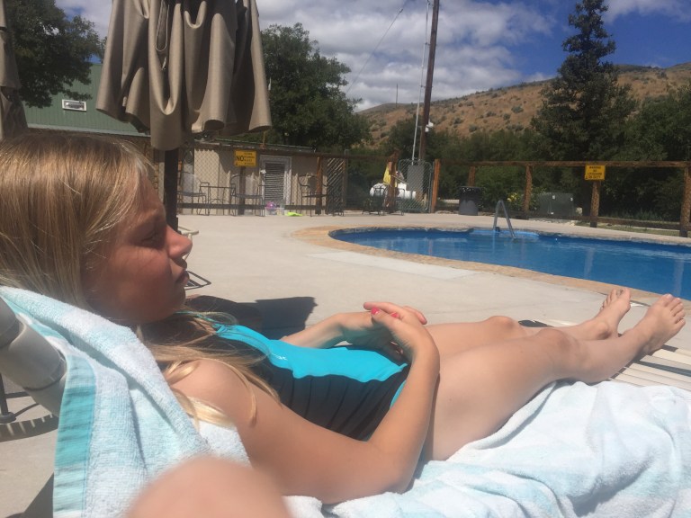 Selvom den er kold – ja både poolen og luften – så har vi snuppet en dag mere her ved den lille Creek. Vi trængte til ikke at køre, men bare være. Så vi er vågnet langsomt, har spist bacon og æg, vasket tøj, dimset (for her er wifi der virker – alle mine 600 billeder er back-uppet i dropbox i nat) og læst.