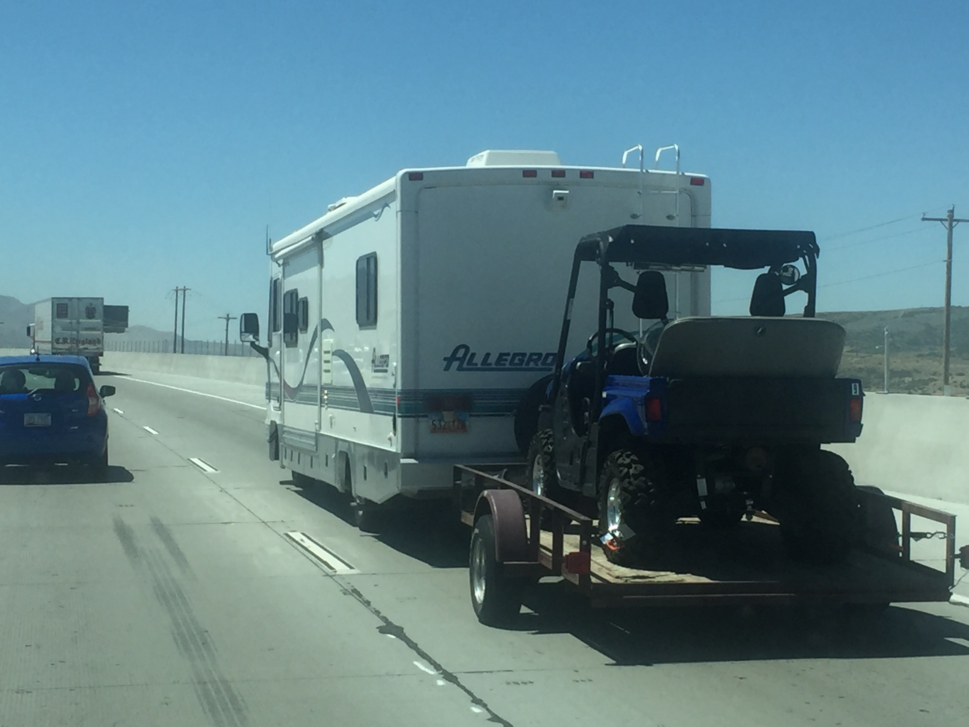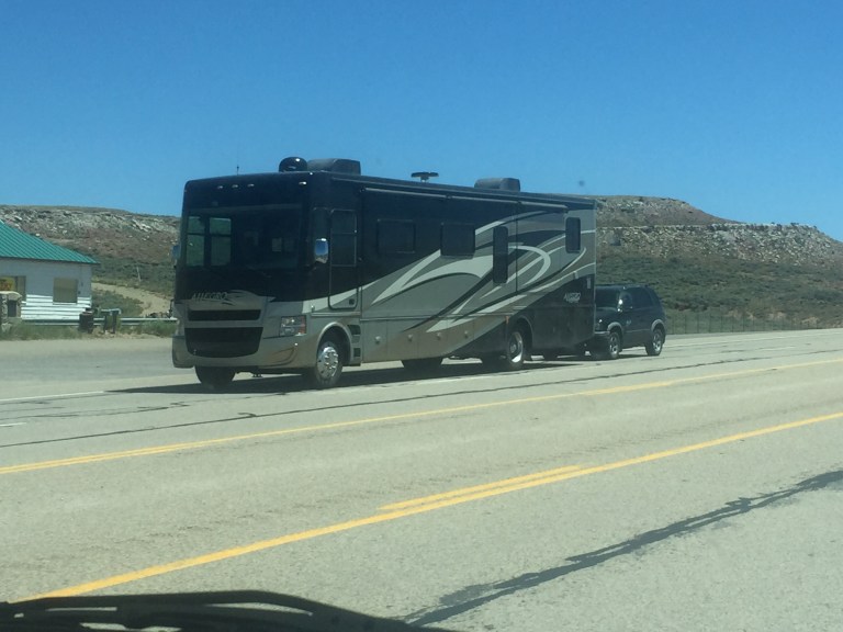 Gerne med anhænger bag på deres RV med en bil, cykler bag på denne bil, kanoer på toppen osv. Nå ja eller en hel anhænger med motorcykler indeni. Jeg prøver lige at fange et par billeder af dem 🙂