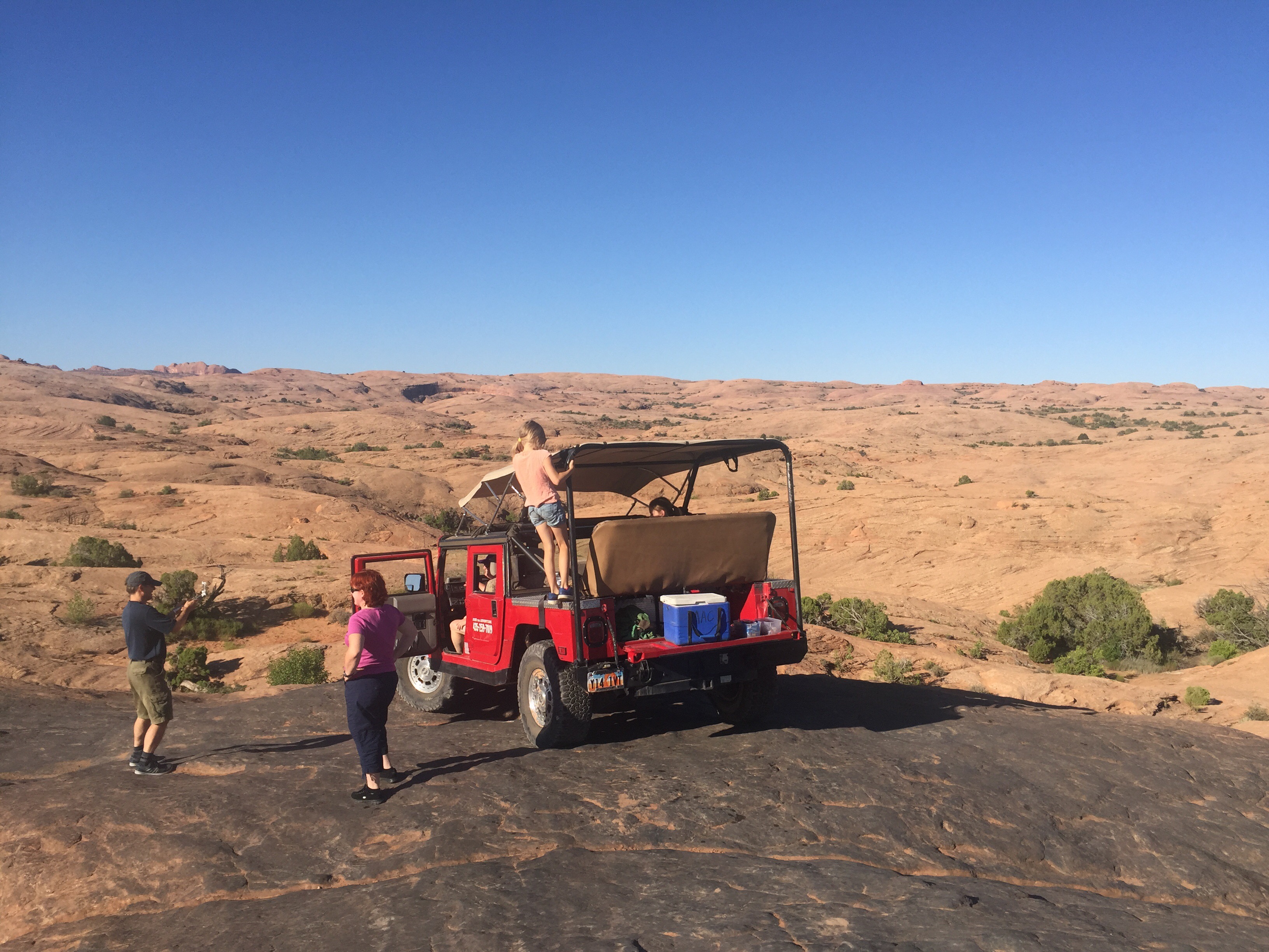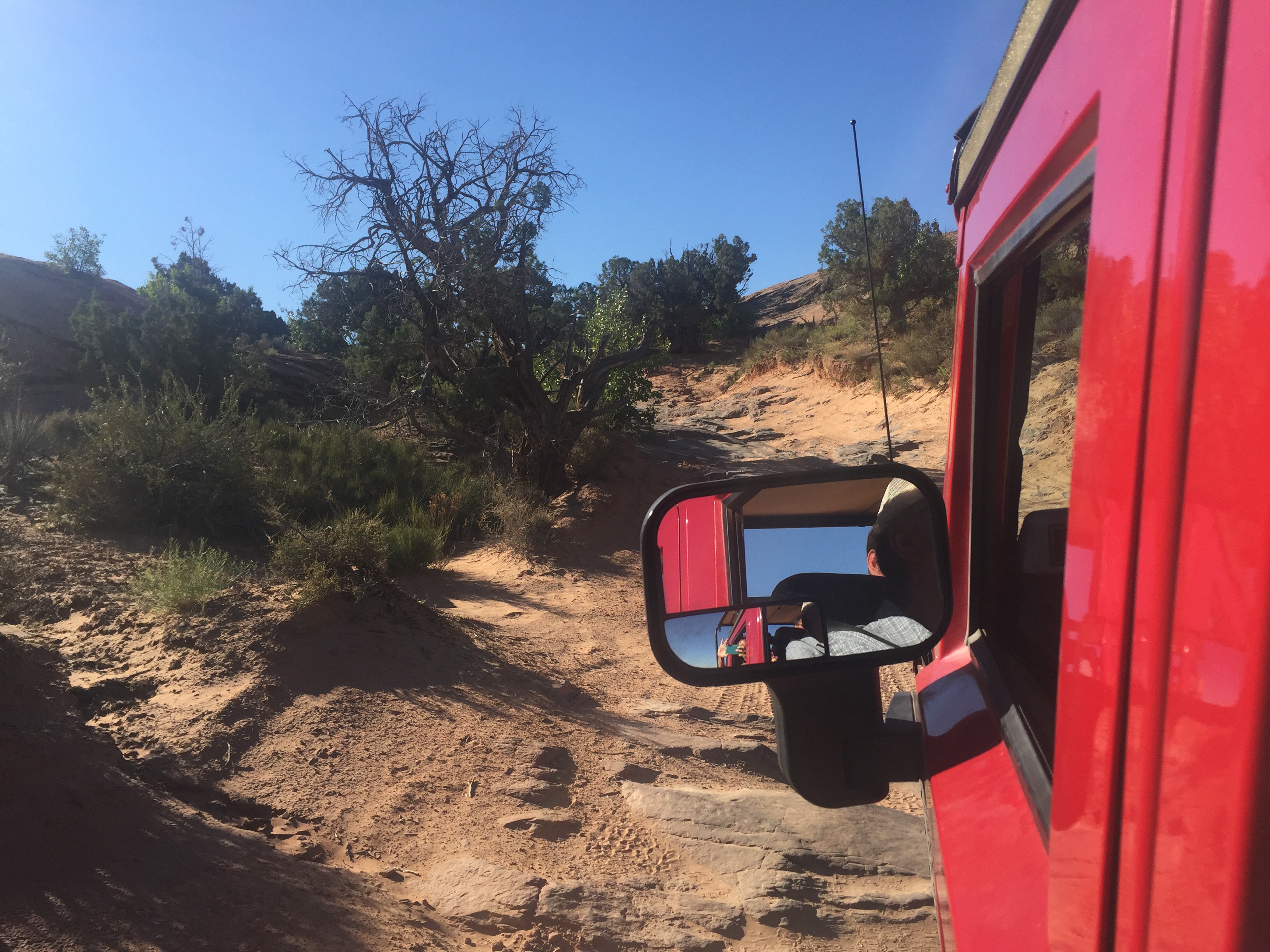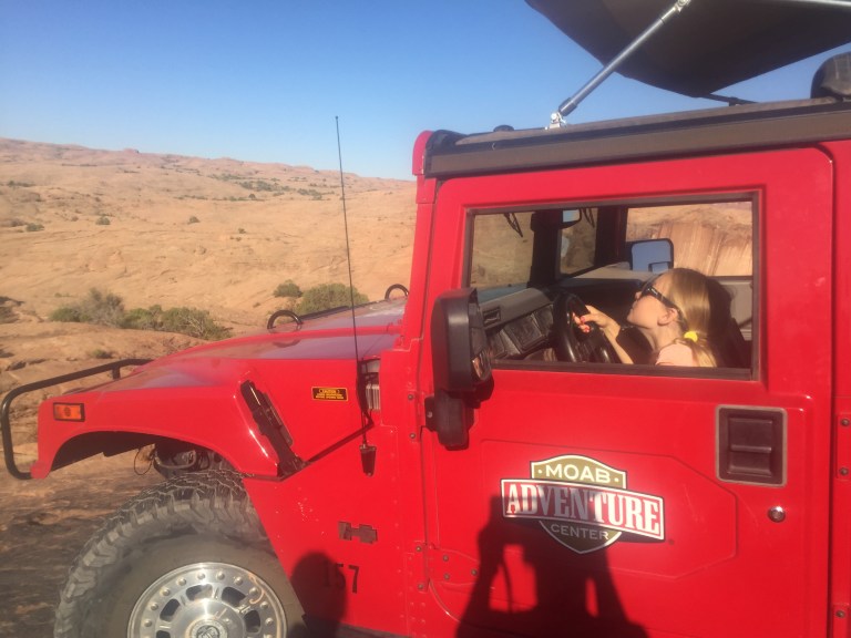 En helt skør “vej” eller nærmere et klippetrail i baglandet bag Moab. Det gik for det meste meget langsomt mens hummeren åd sig langsomt op af klipperne. Vores chauffør George gav den dog også lidt gas i sandet og ned af en enkelt klippe der hedder “rollercoaster clif”:-)