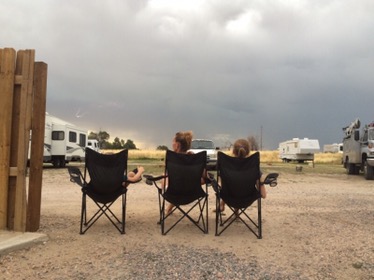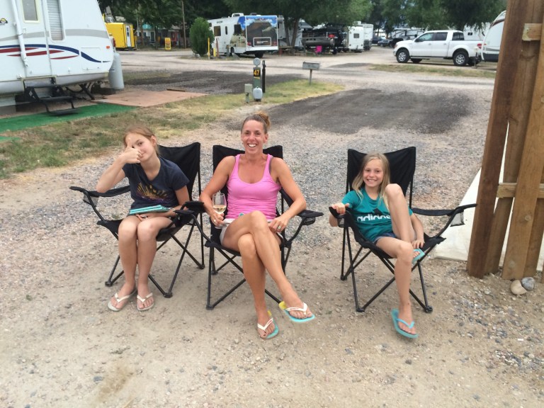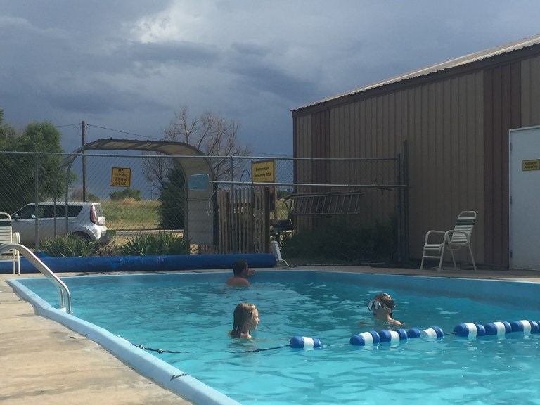 Vi kom frem til KOA pladsen øst for Denver, hoppede i poolen kortvarigt, jeg strikkede min bluse færdig og vaskede i hånden.