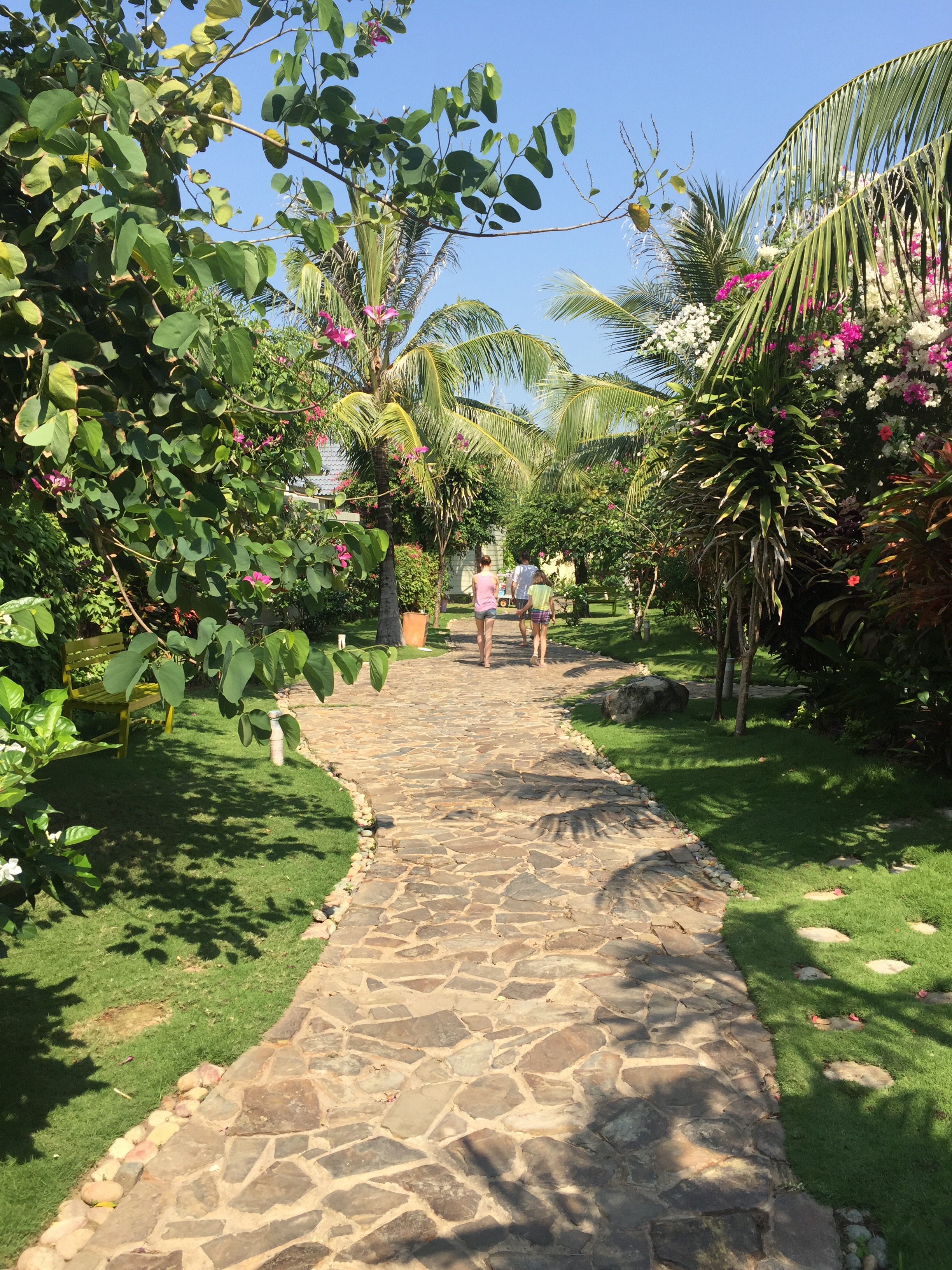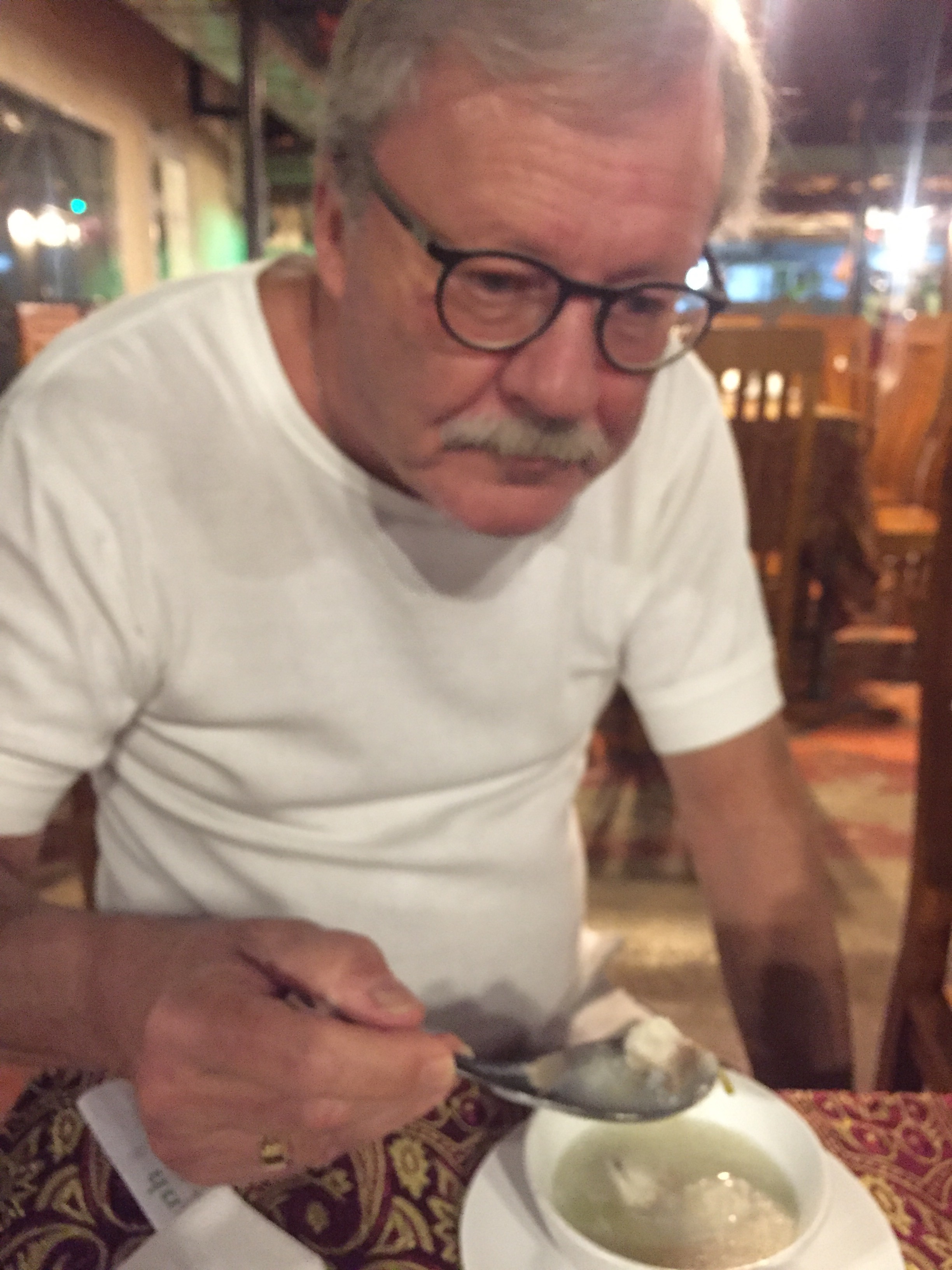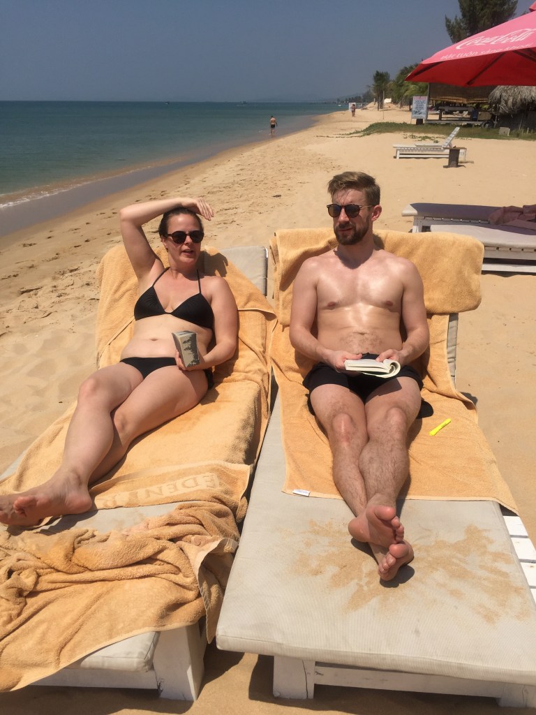Børn og kvinder delte kyllinger som kom lidt for genkendelige på bordet fx inkl fødder, en del (fantastiske) forårsruller og kedelige pomfritter. Hertil lunkne øl.