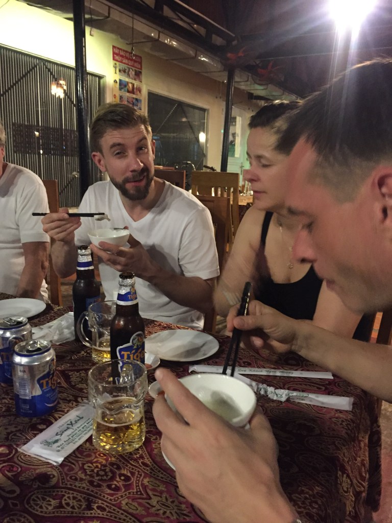 Der var mange neon lys og scootere og meget aktivitet. Vi tog to taxaer ind til byen, og der var en del forvirring om, hvor vi gerne ville sættes af. Så vi endte foran en restaurant ved floddeltaet, hvor sprogbarrieren var stor, og vi gættede os frem til, hvad vi bestilte ved at pege og tælle fingre osv.