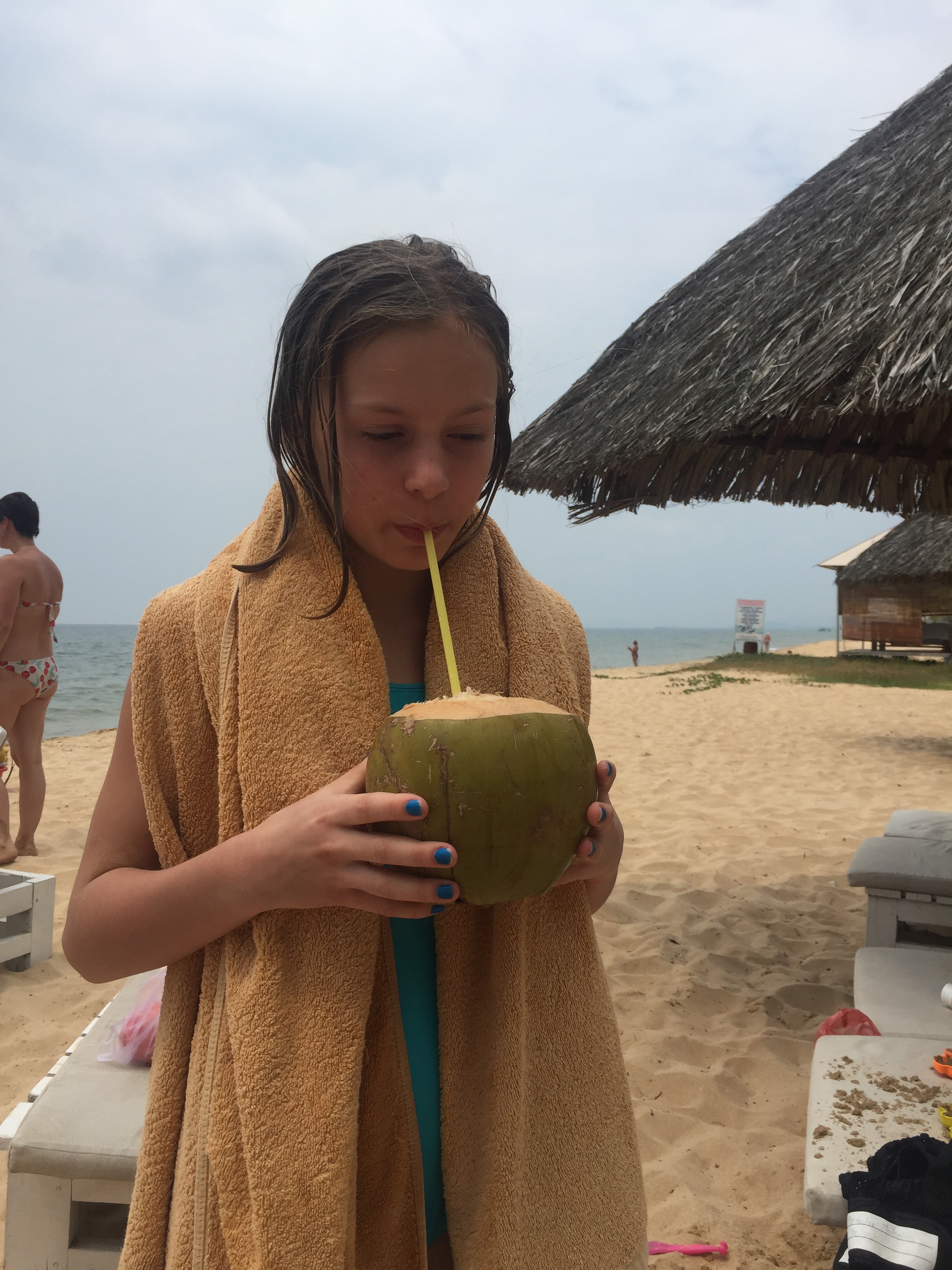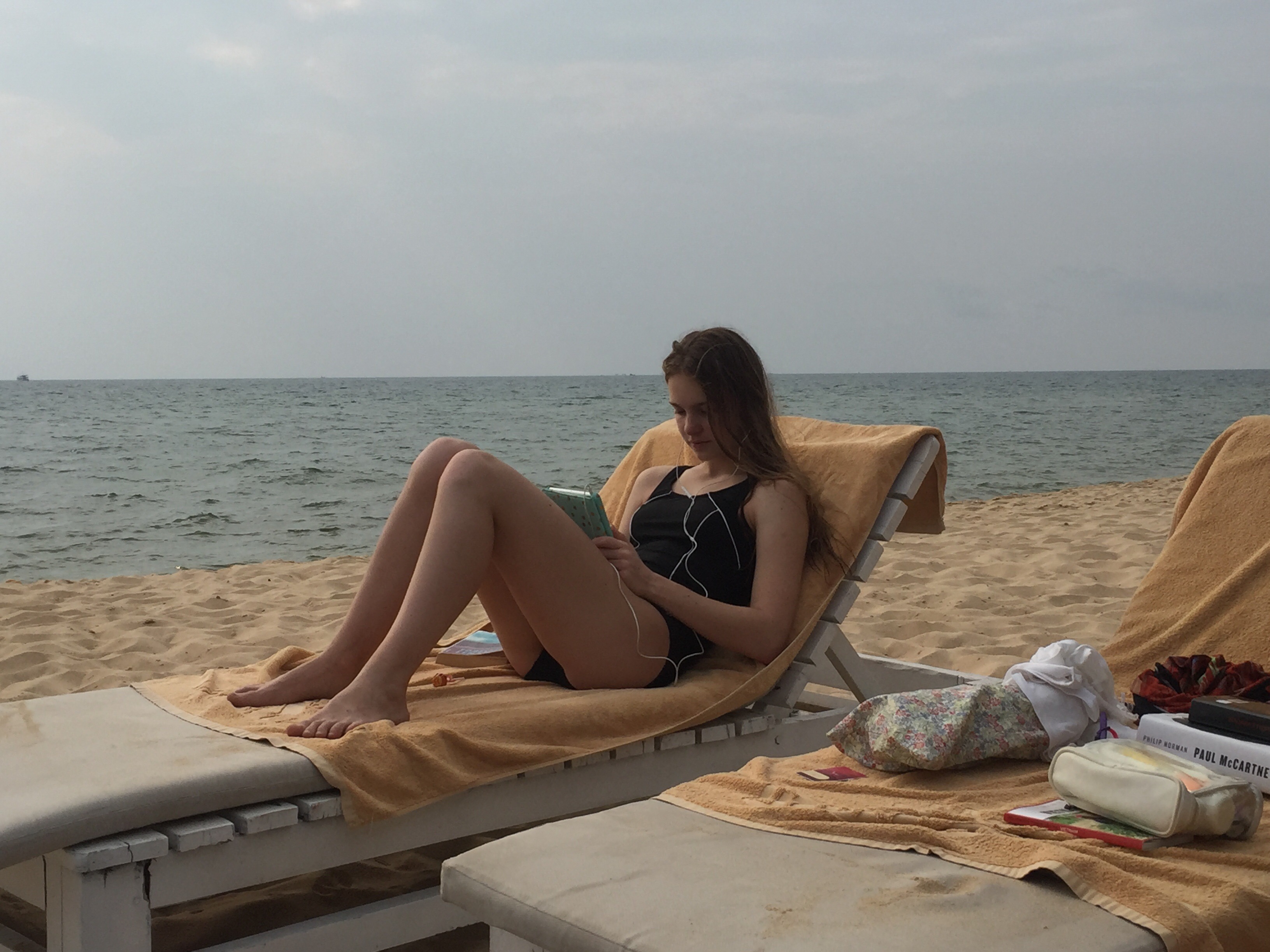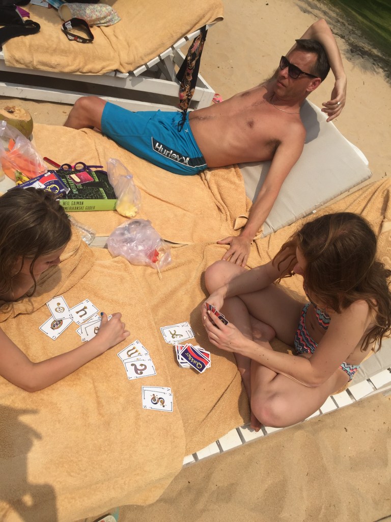 Vi har spist frugt og spillet spil på stranden : “fisk” og “quiddler”.
