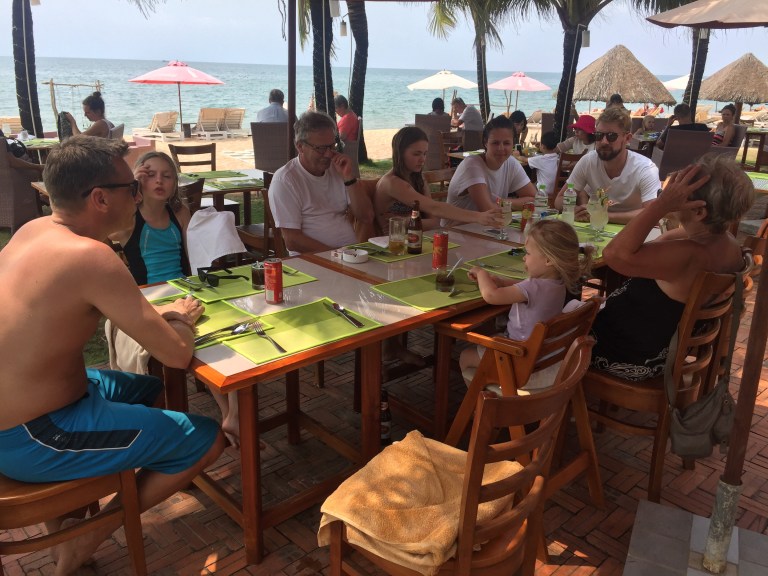 Middag på resortet efter en tur i baren. Her er igen gallamiddag – denne gang er det vist Vietnam Post, der har lejet sig ind.