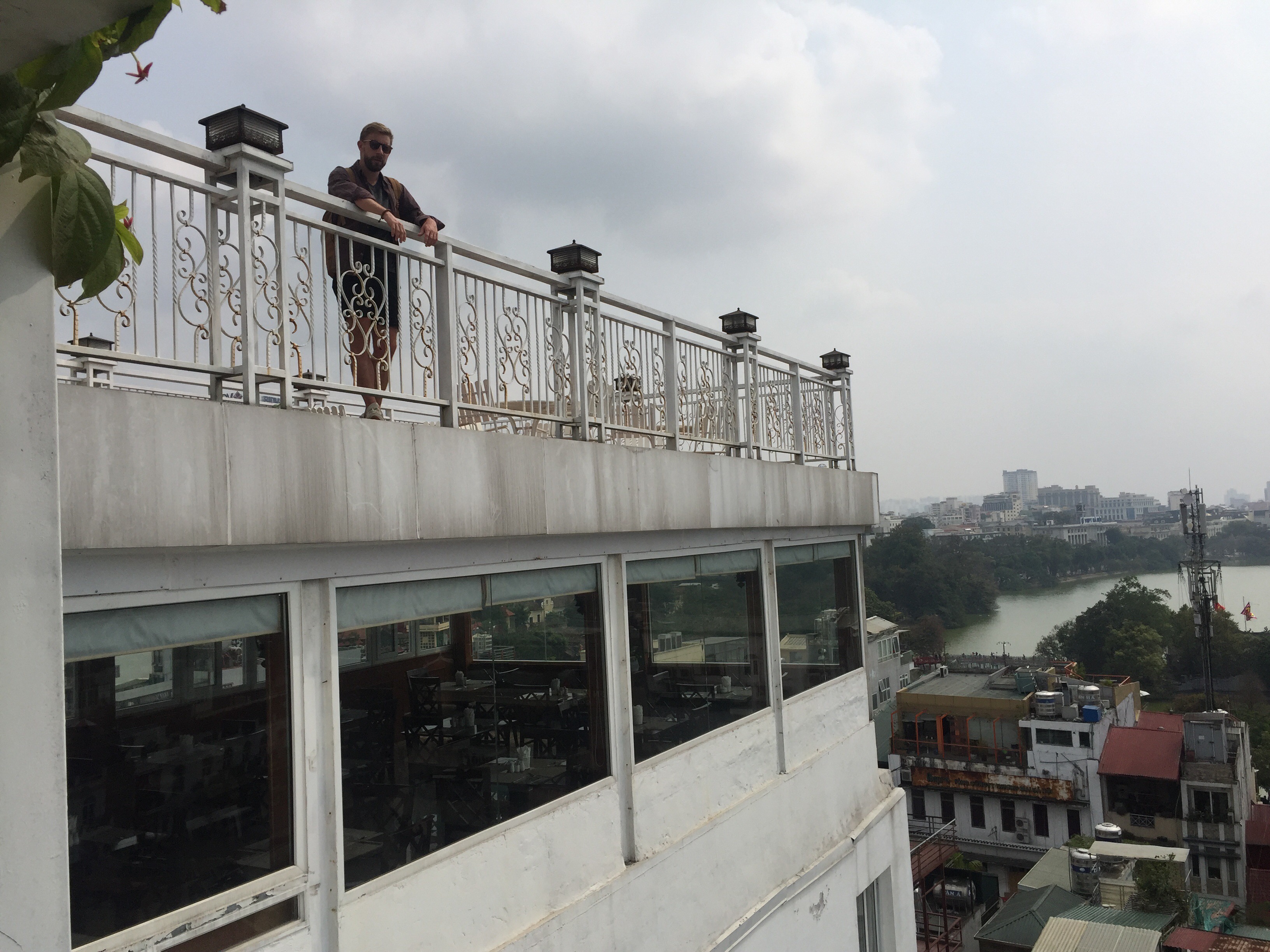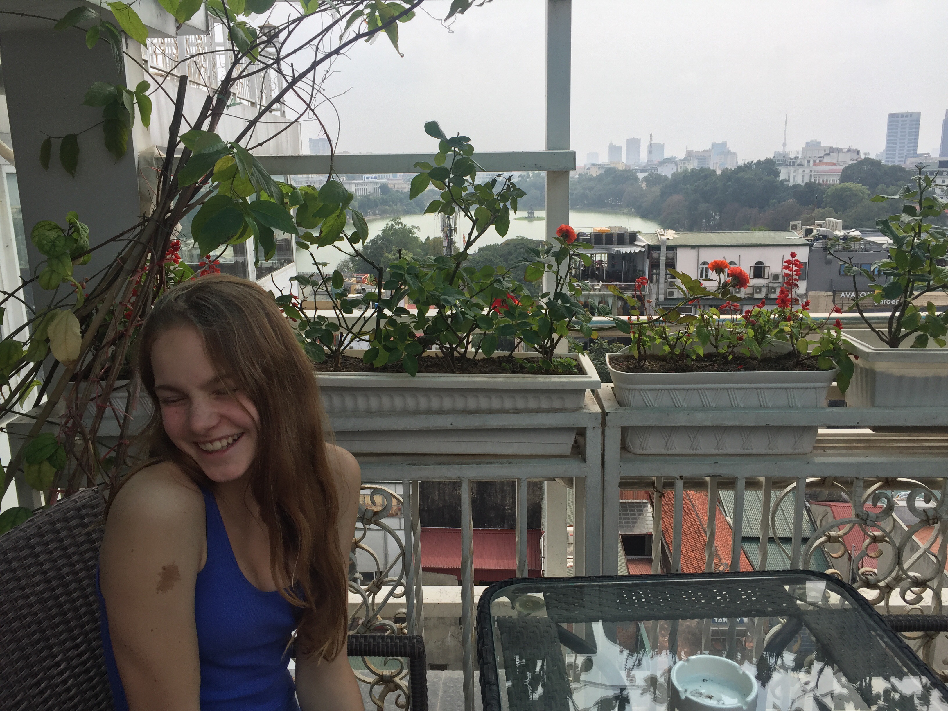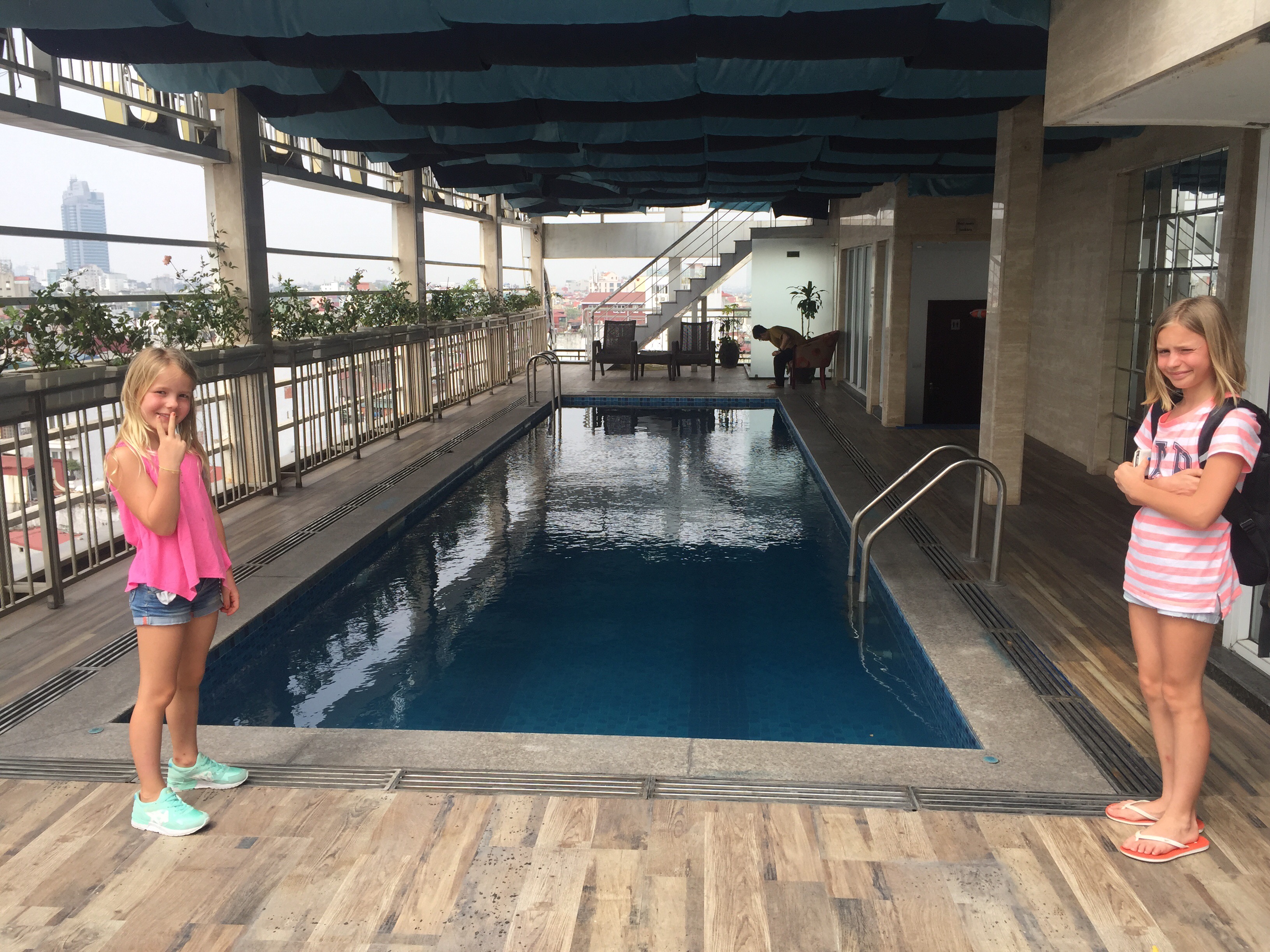 Værelserne var ikke klar, så vi puttede Elise i klapvognen og drak en øl og vand på tagterassen. Her er pool på taget og vi skal bo på 9. sal bla på hotellets største værelse med udsigt over søen og byen.