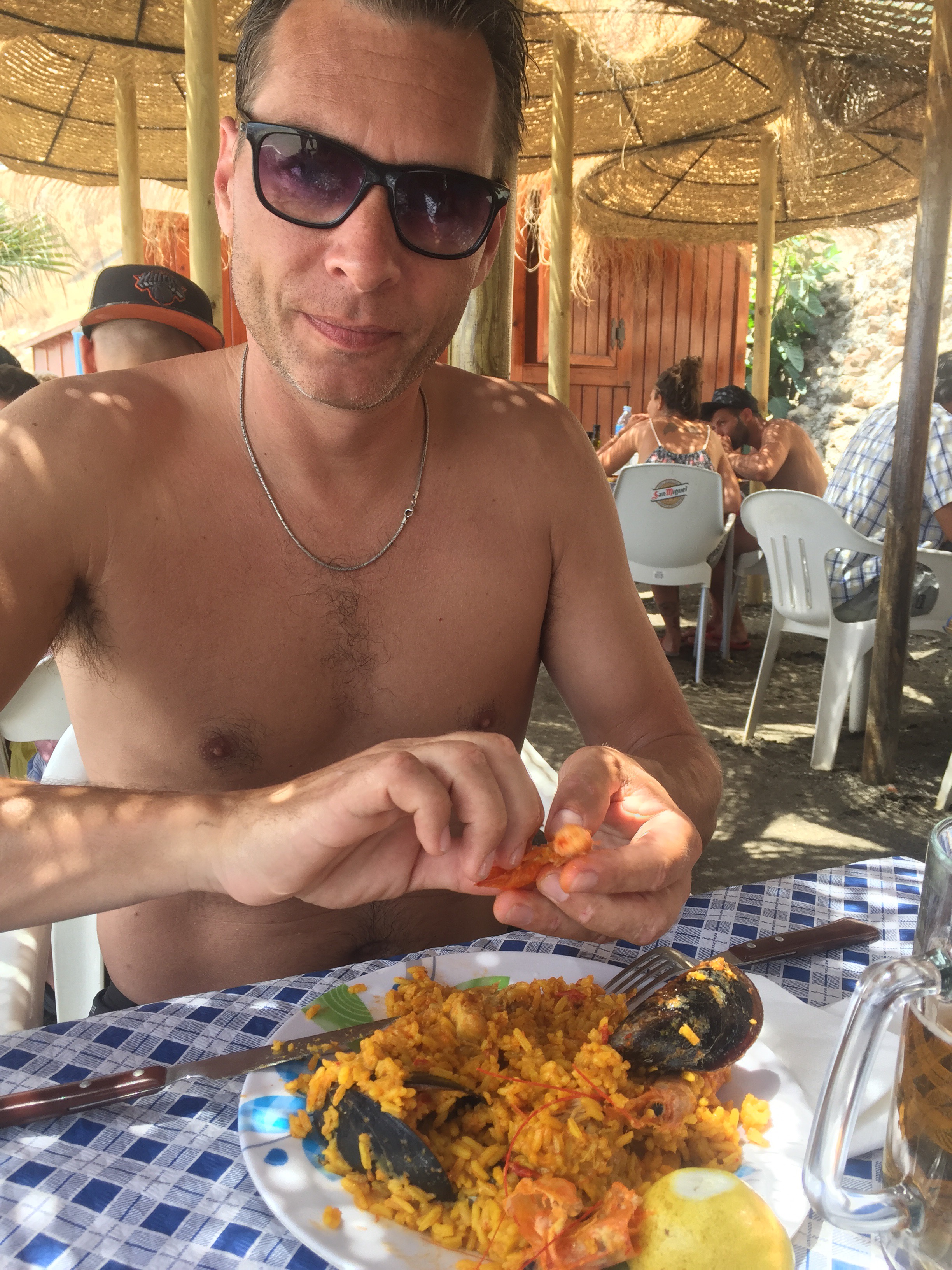 Vi fandt en del små slebne glasskår (hmmm) og spiste frokost på strandbaren. Og før vi så os om var kl 6.