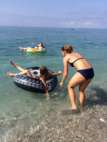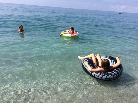 På vej ud i vandet med baderingene råbte Carla pludselig, at hun var blevet brændt. Og ganske rigtigt – en af de små lilla brandmænd/gellyfish (lokalt kaldet “Medusa’er” på størrelse med en lille mandarin) havde ramt hende på håndleddet og det sved og brændte.