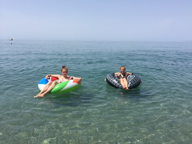 Vi svømmede alle fire rundt om en lille pynt langs klipperne og så også søpindsvin, søpølser og mark og pigerne så en kæmpe rokke.