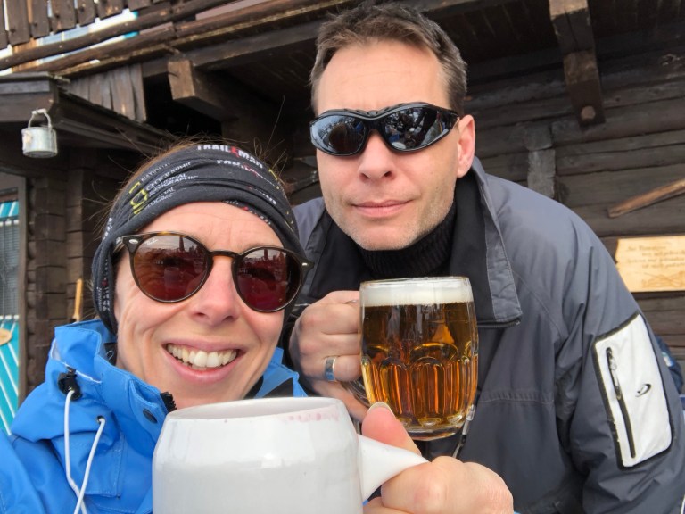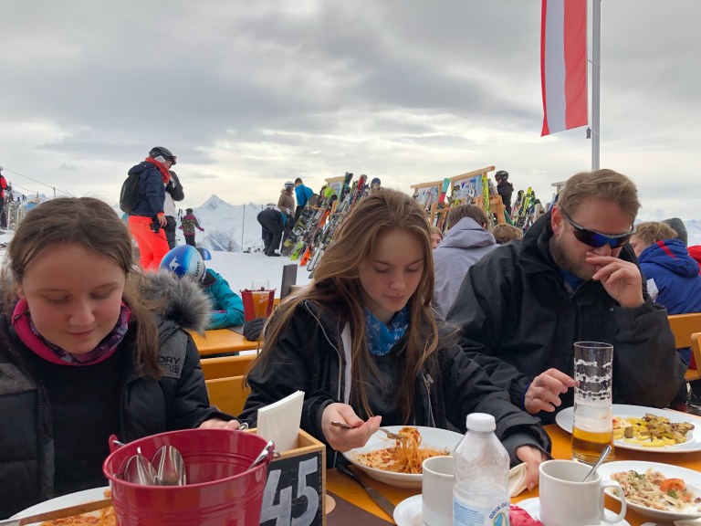 Vi spiste en skøn gullashsuppe udendørs og begav os meget søvn-underskuds-trætte ned ad bjerget ved 14 tiden. Joke havde ikke været på ski men hentet nøgler til lejlighederne (meget fine og med god plads- pigerne har 1.sal og de voksne 2.sal) og betalt skiskolen.