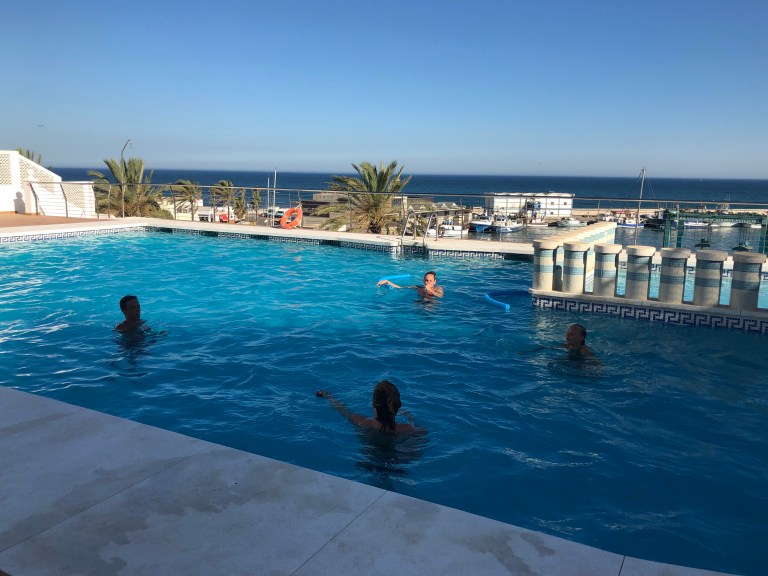 Et smut i poolen før aftensmaden, som vi stykker sammen herhjemme og sikkert ender med at spille spil.
