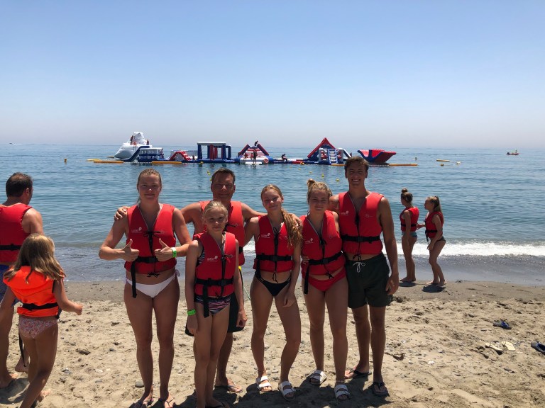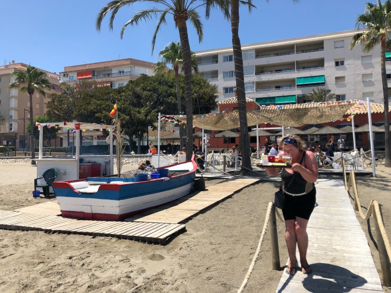 Sidste hele dag i Estepona: løbetur, morgenmad på cafeen, stranden. Seks ud af ni kastede sig ud i tur på vandhoppeborg. Jeg svømmede for første gang hernede – vandet er endelig blevet “varmt” nok. Farmor fik massage, farfar fik fadøl.