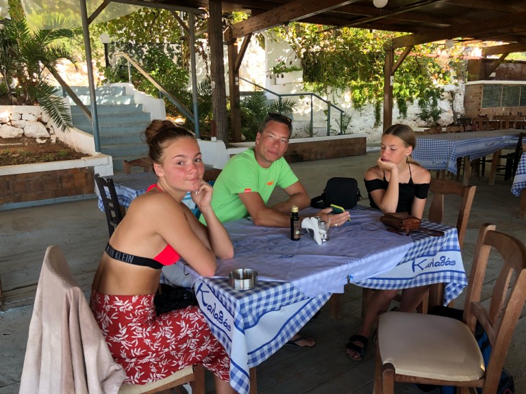 Efter en lidt ubeslutsom morgen kørte vi på strandopdagelse først til en strand hvor filmen Zorba er optaget (kender den ikke men den modtog 3 Oscars i 1964) og derefter kørte vi videre til en lille bugt, hvor vi spiste ægte græsk frokost og hilste på en 18 år gammel hund og en del katte:-)