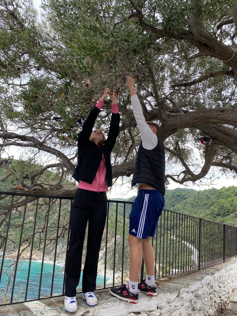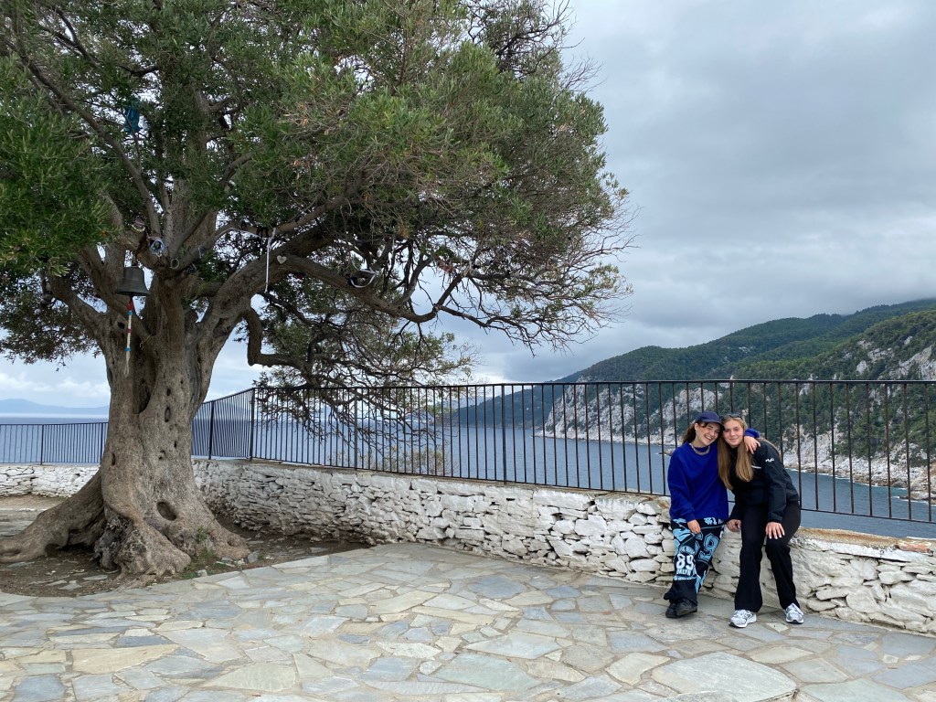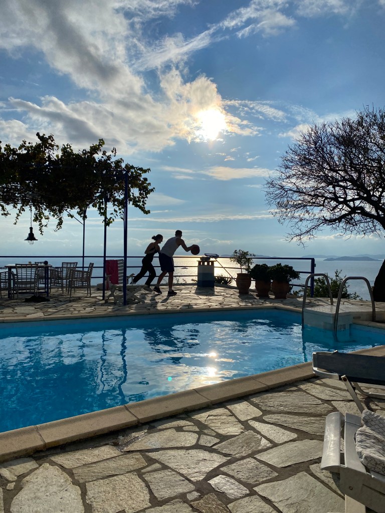 Liva, Eik og jeg ville lige hente 3 ting til maden i Loutraki, men der var søndagslukket. I stedet købte vi Pita souvlaki med hjem til alle i (den anden bil var kørt direkte hjem men havde ingen nøgle og ventede på os ved poolen). Vi fandt en basketbane til Eik og Liva i Glossa på vejen hjem. Så for at gøre klar til besøg på den lokale skoles basketbane, varmede de lidt op hjemme på egen “bane”.
