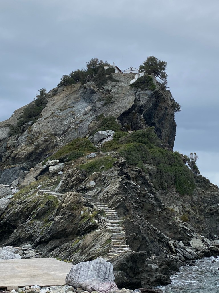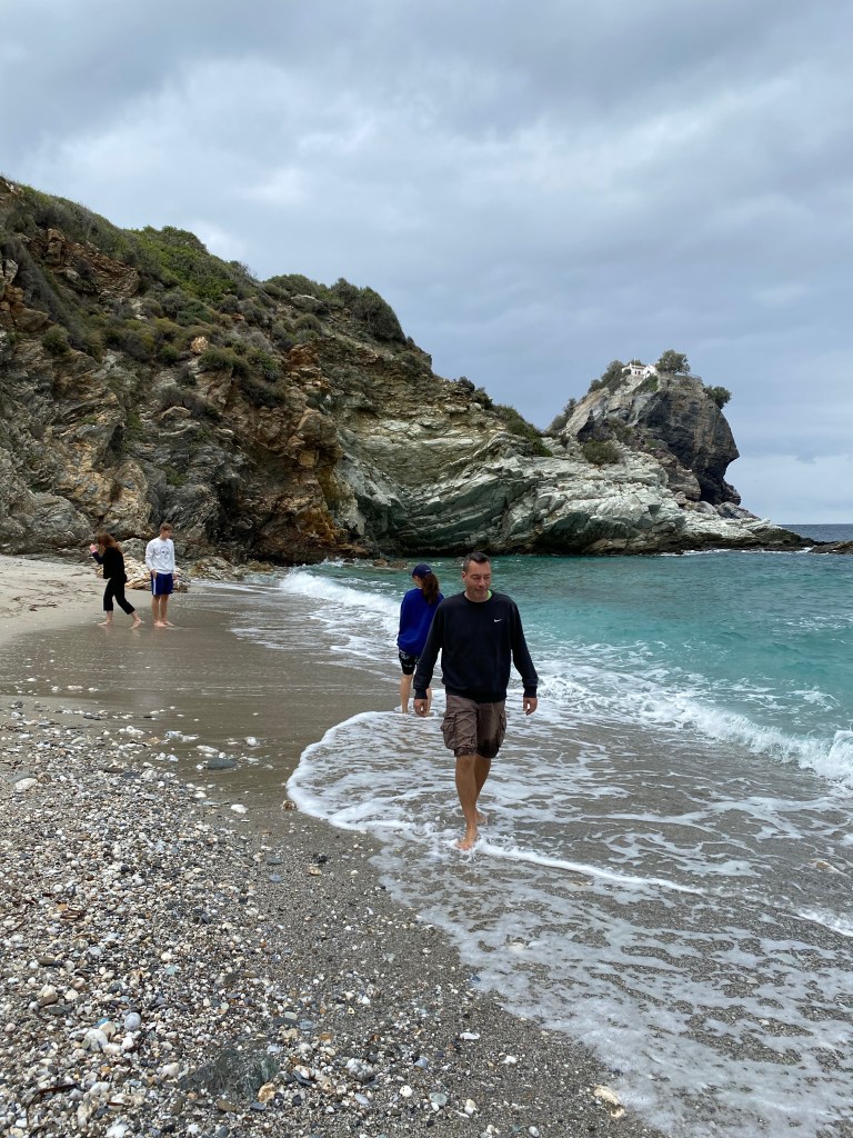 Efter opstart af strikketøj, badning og en ekstra snack/frokost kørte vi til Ioannis kapel – kendt fra bryllupscenen i filmen Mamma Mia. Der er meget fint og også her var vi de eneste turister. Vi dyppede tæerne og fik våde bukseben på den lille strand ved siden af.