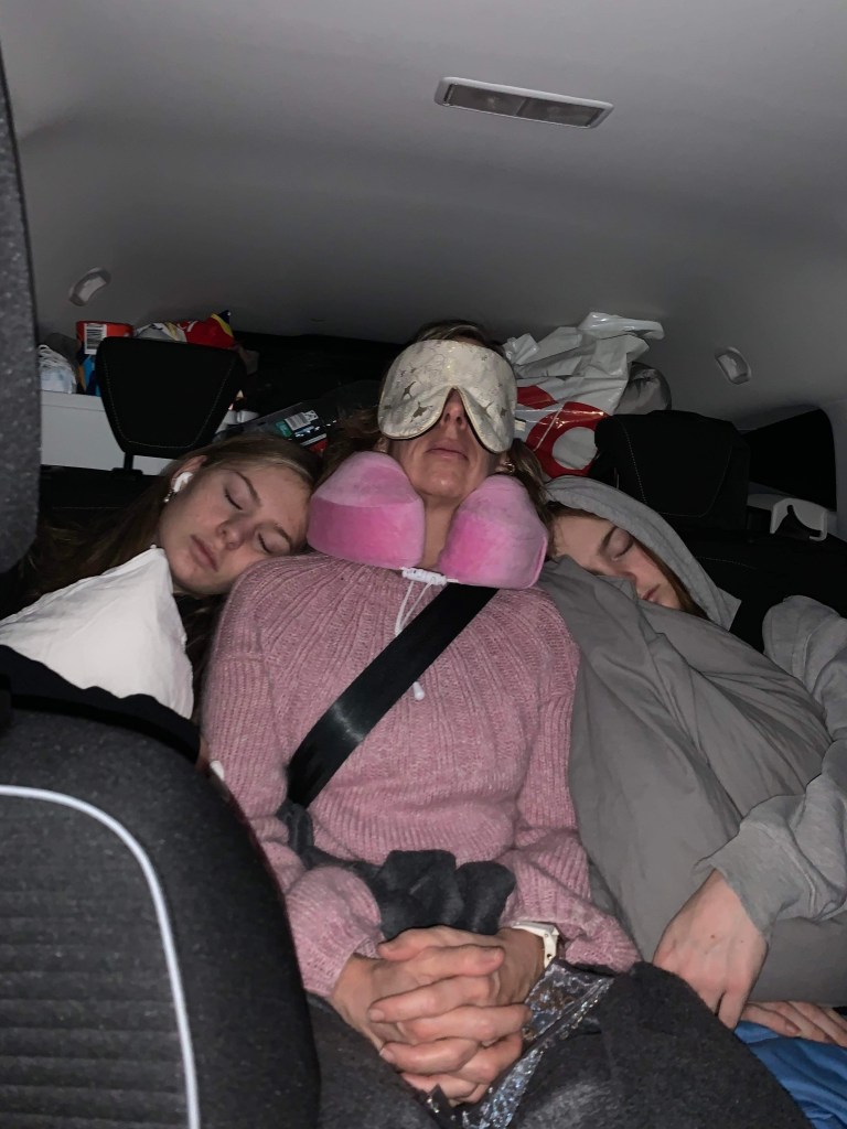 Vi tankede både benzin og McDonalds i Røde Kro i Sønderjylland og derfra gik det slag i slag igennem Tyskland. Jeg kørte kun fra 22-24, og igen fra 03-04.45. Eik fik passagersædet ved siden af Mark for at give plads til de lange stænger. Dermed var vi tre hunkøn på bagsædet – moren i skruestik mellem døtrene. Jeg har ikke sovet meget mere end en time sammenlagt – de unge nok noget mere om end ikke optimalt.