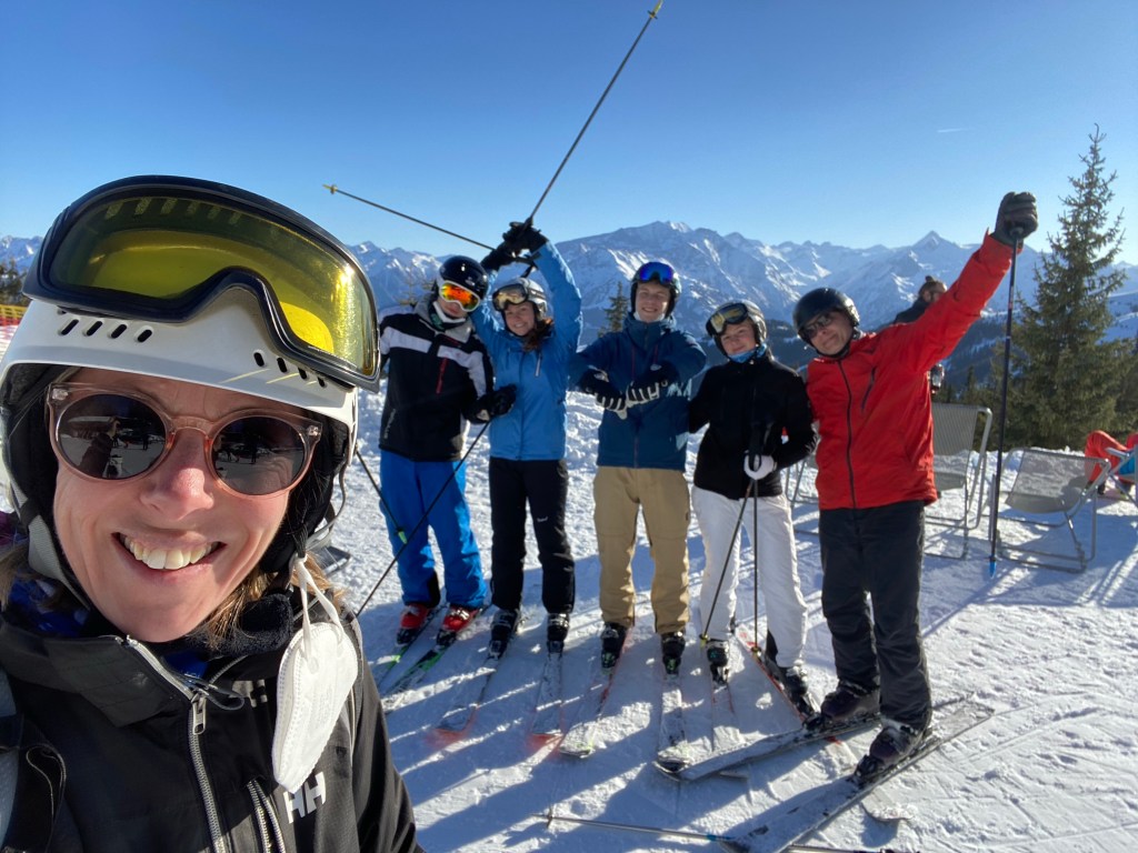 Vi skal have mundbind på i liftkøerne, kabinelifte og det er skisme besværligt når ens ører er pakket ind i hjelm. Derfor flagrer det rundt med masker som er suret fast til hjelmen på kreativ vis. Det er helt skørt at vi skal ha dem på udendørs i stolelifte. Vi skal vise Coronapas nogle steder men ikke alle. Det går nok men er lidt bøvlet…