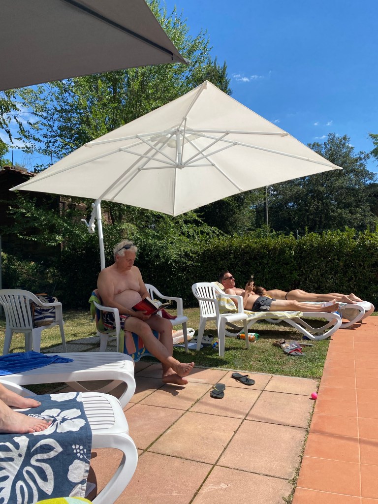 Ingen gad noget som helst i dag, så vi har drevet hele dagen ved poolen fra ca kl 10, hvor skyggen forsvandt fra området. Vi har bare daset, haft to sessioner a la farmor med vandaerobics 😆, hørt musik, løst krydsord, læst, skiftevis været på luftmadrasser og henad kl 16 brød poolselskabet op.