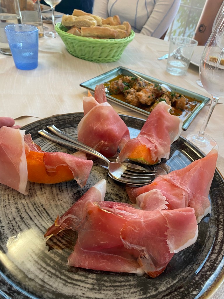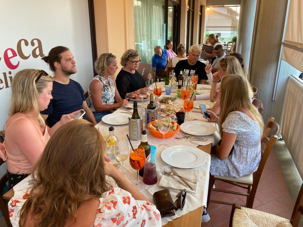 Kl 19 kørte vi til endnu en af værtsparret anbefalet restaurant. Venelia. Vi sad udendørs og fik dejlige forretter og god vin og de unge fik Aperol Spritz. Hovedretterne var mindre gode. Dan ventede længe på sin mad der var blevet glemt og vores Angus måtte en tur tilbage på grillen.