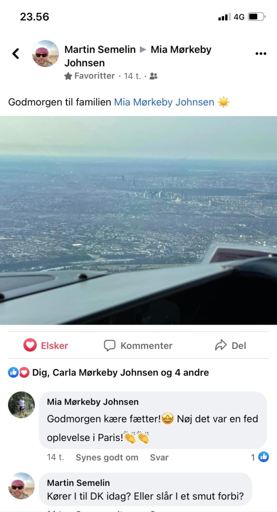 Afgang Paris 8.45 og på vej ud af byen skrev min pilotfætter Martin en godmorgenhilsen fra luften over Paris: