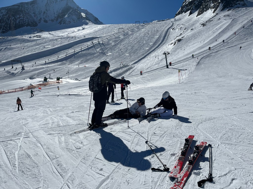I dag havde vi aftalt at køre til gletcheren Kitchsteinhorn – stadig i blændende solskinsvejr. Vi parkerede bilen 8.20 og sad i liften da den åbnede. Det tager mere end 1/2 time at komme helt op med tre lifter men belønningen var skøn med frostsne og høj sol. Også her mødte vi Villy og senere Valdemar. Det er flippet at være helt på toppen – over trægrænsen – og det hele ligger for ens fødder (eller ski om man vil)