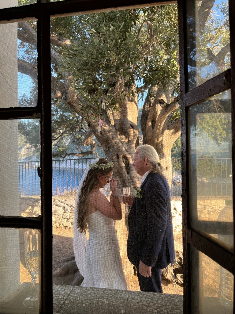 Ved 6-tiden kørte vi op til “Mamma Mia” kirken. Der var bryllup – som i filmen. Vi nød udsigten sammen med flere andre.