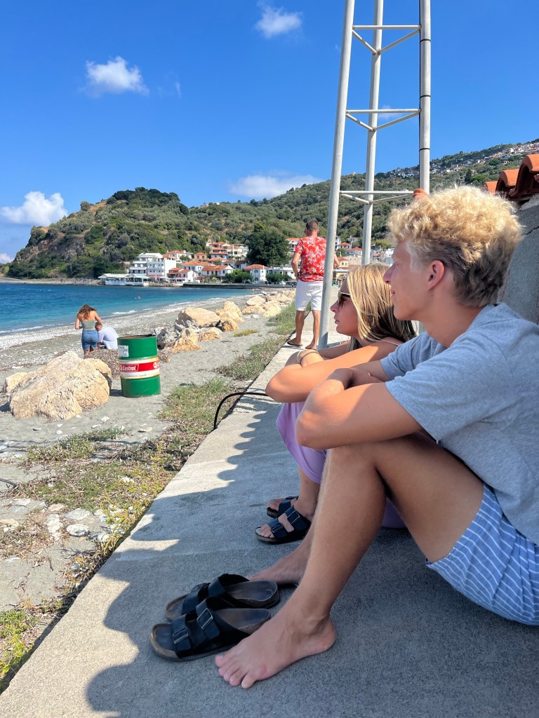Vi tog afsked med huset 9.45 og tankede bilerne og afleverede den på havnen. 10.45 kom vores færge og det tog 45 min med overfarten til Skiathos.
