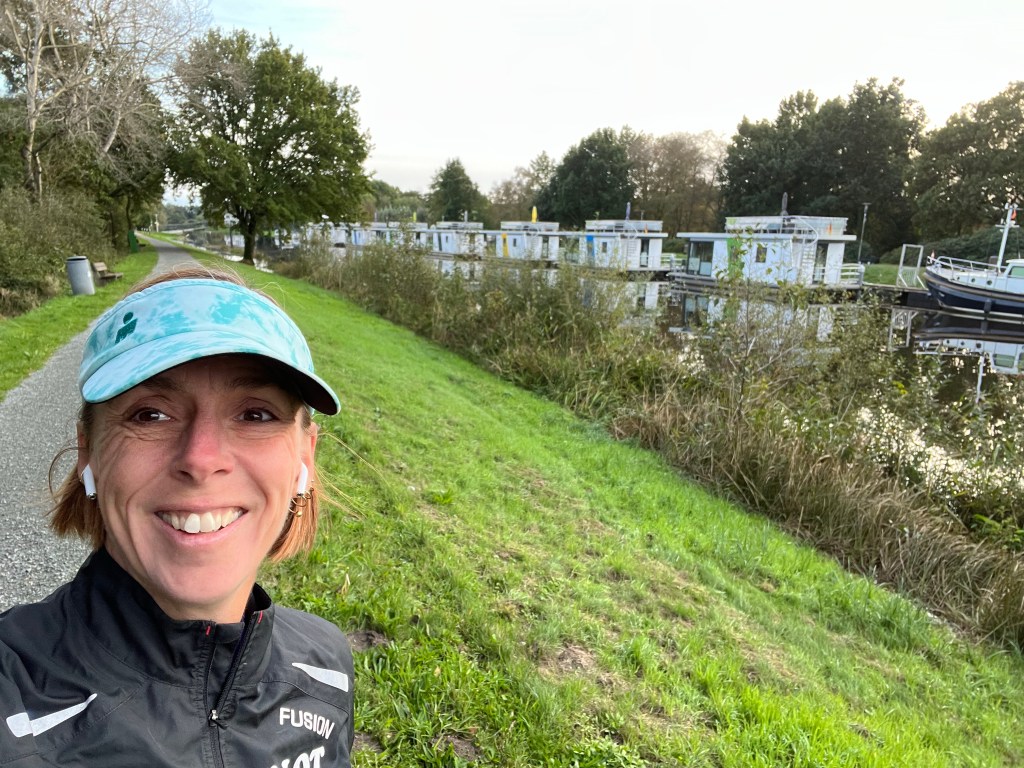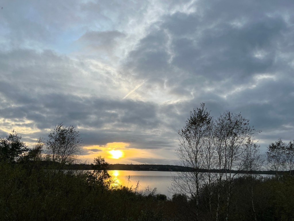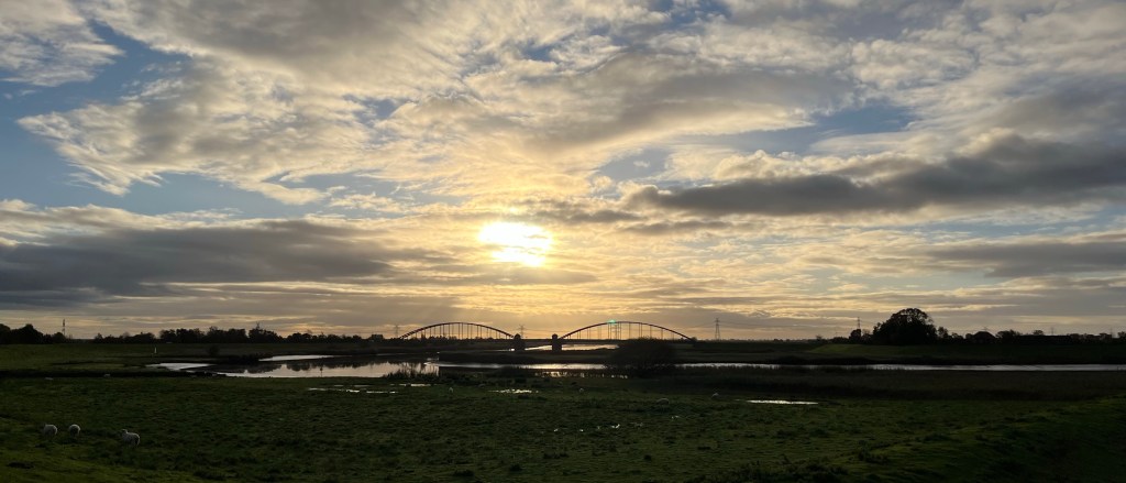 Vi har gået morgentur før morgenmad begge dage, samlet appetit. Vi gik op på diget og så sluserne og ud over Ejderen og broen over.