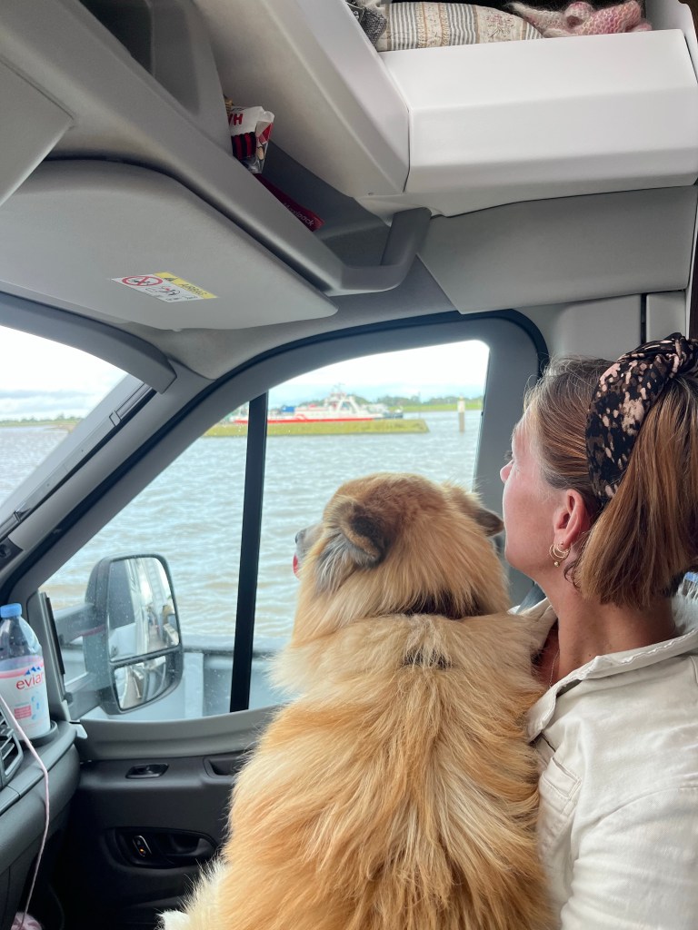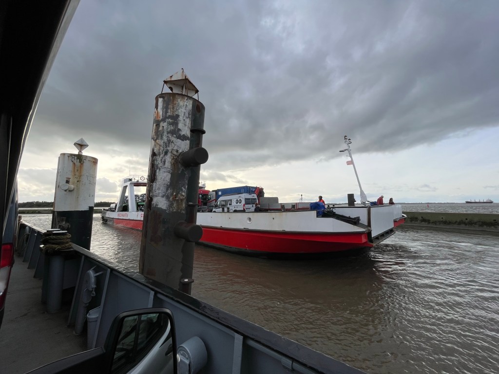 Vi kørte til Glückstadt, gik en hurtig tur i byen og kørte så i kø til en lille færge over Elben til Wischhafen.