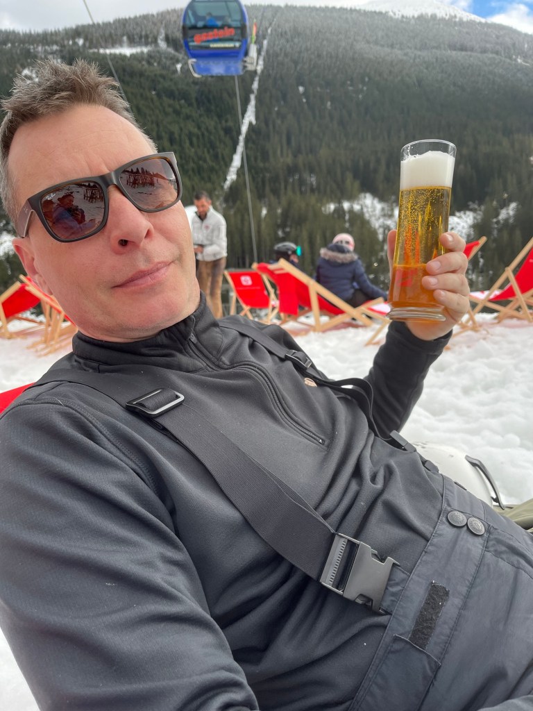 Ligesom vi satte os i en liggestol med fadøl og glühwein forsvandt solen dog og vi sluttede med at tage liften NED til Bad Gastein, da vi absolut intet kunne se.