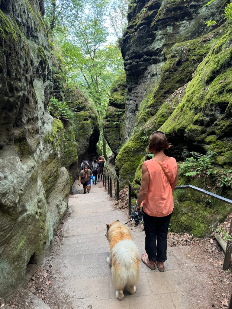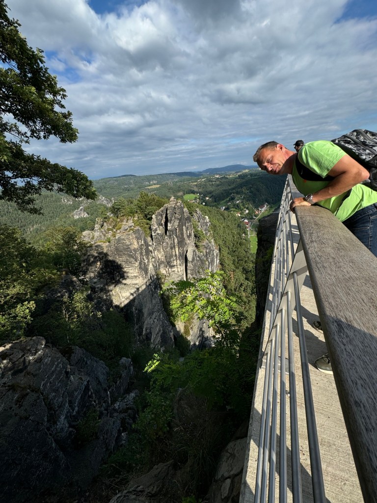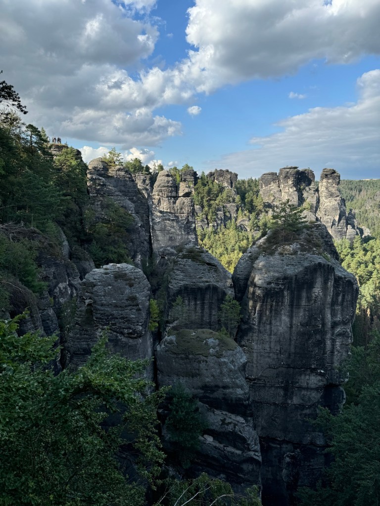 Ca 16.30 var vi ved Bastei, et flot område af nationalparken “det sachsiske Schweiz”. Sandstensbjerg-formationer og knudret skov i skøn forening.