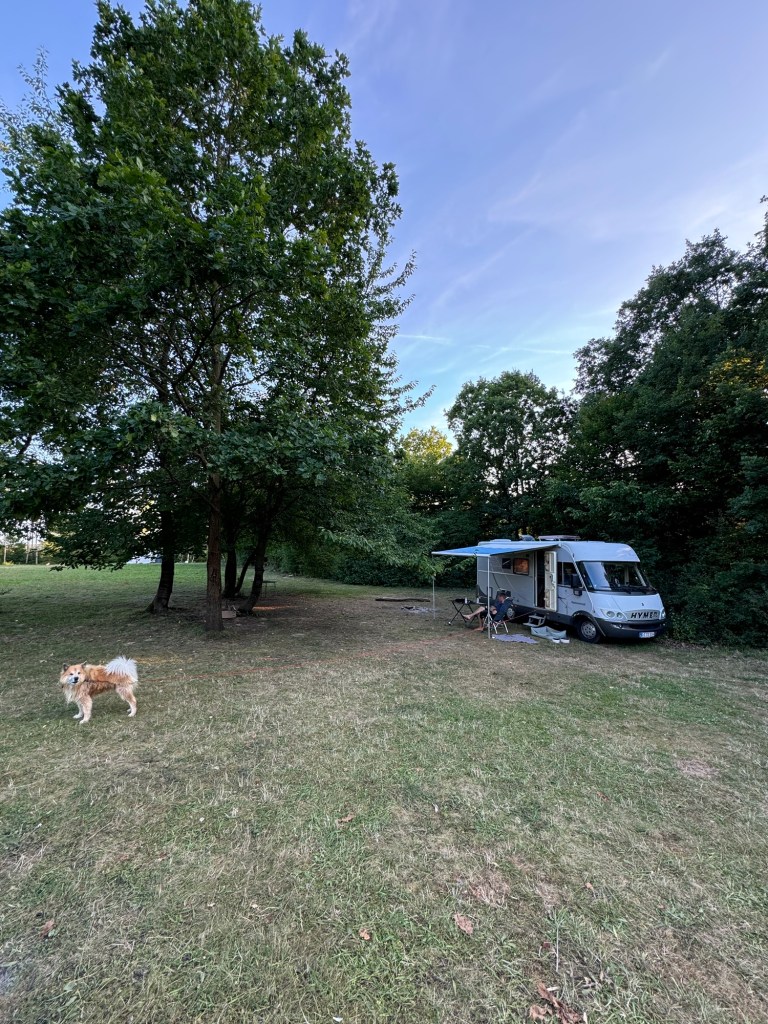 Efter en god halv time i skoven, tog vi opvasken og så hoppede jeg også i bad, mens Mark gjorde bilen køreklar. Ligesom vi skulle ned for at aflæsse spildevand, var der en mand med campingvogn som påkørte kantstenen i indkørslen til pladsen (den eneste indkørsel) så han spærrede vejen for alle der skulle ud og os der gerne ville ned til “kloakpladsen”.