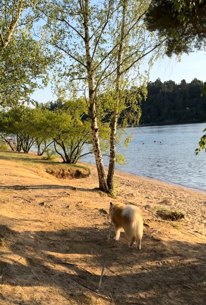 Balder nyder det virkelig, Han virker meget afslappet og lå længe på breden og bare kiggede. Derhjemme ville han have jagtet måger men dem var der ingen af ved søen 🙂