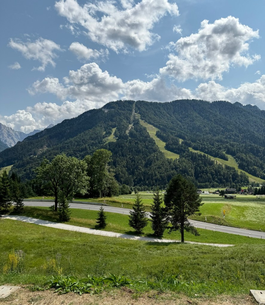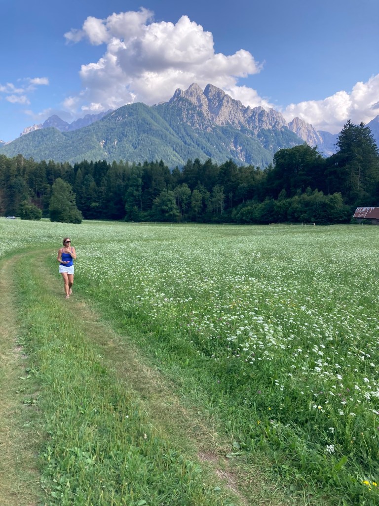 Vi var meget stille i bilen. Og det var ikke ret sjovt. Mark sagde et par gange: “jeg kan ikke li det”… (Heller ikke jeg) Godt vi blev belønnet med denne udsigt kort efter i Kranjska Gora som er et skisportsted om vinteren. Vi kom op fra 600-1000 m på 5 km.