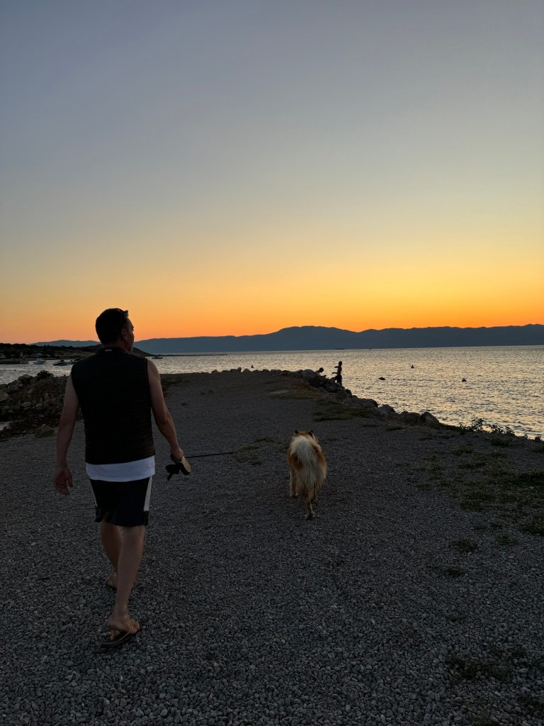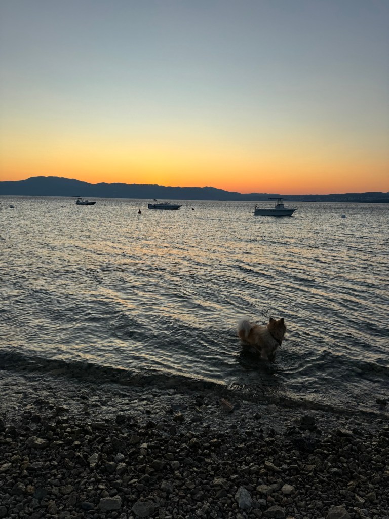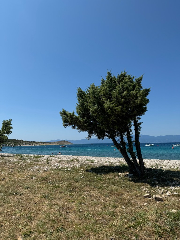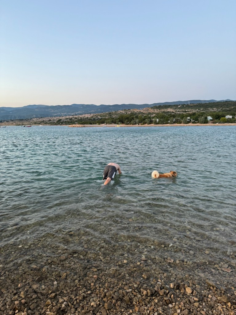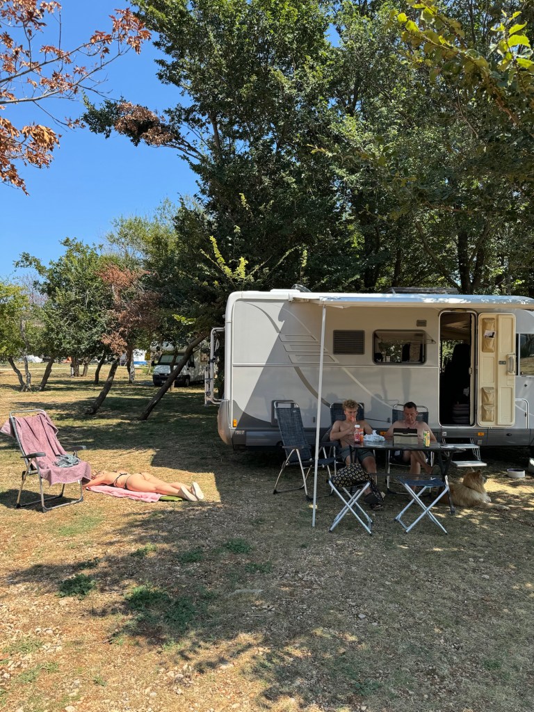 Vi har taget en stor plads – med pool og hele molevitten. Ikke det jeg bedst kan lide, men vi har fundet et sted, hvor vognene ikke står på pladser, men frit mellem træerne – perfekt til os med Balder, med 100 m ned til hundestranden i Adriaterhavet. Det koster 110 euro for en nat. Skidedyrt men pyt.
