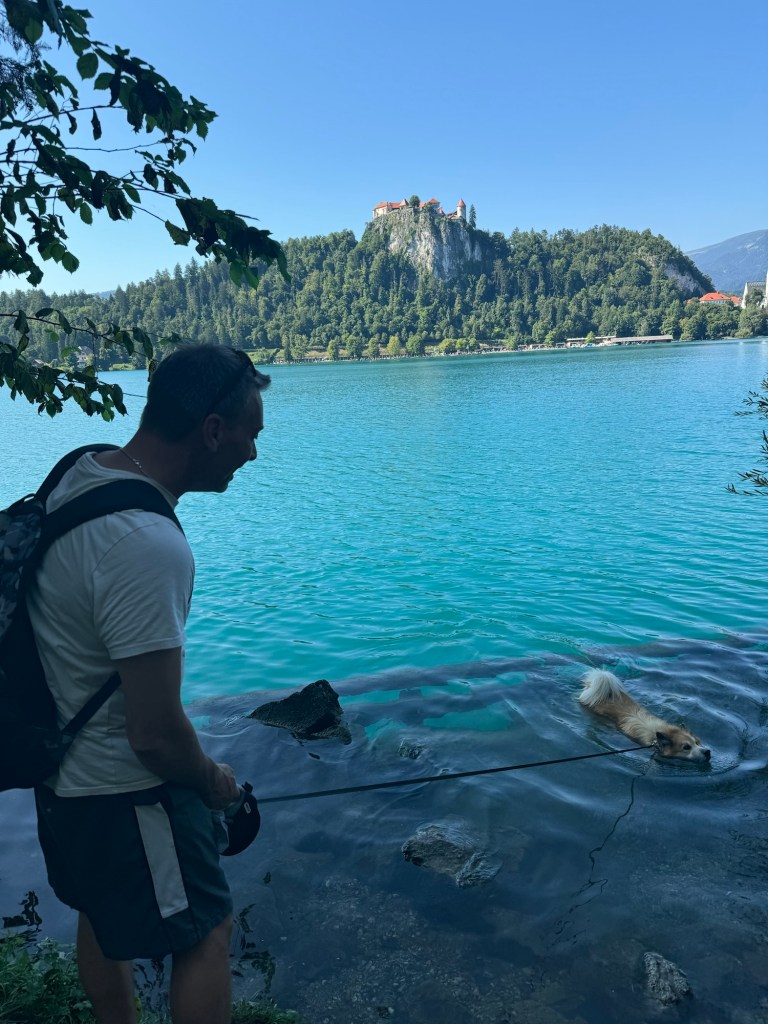 Balder var den første i det klare vand! Og også den sidste – han sprang i et lidt dybt sted og fik hele sin lille hundekrop under med hele kroppen og hoved. Det så virkelig sjovt ud.🤣
