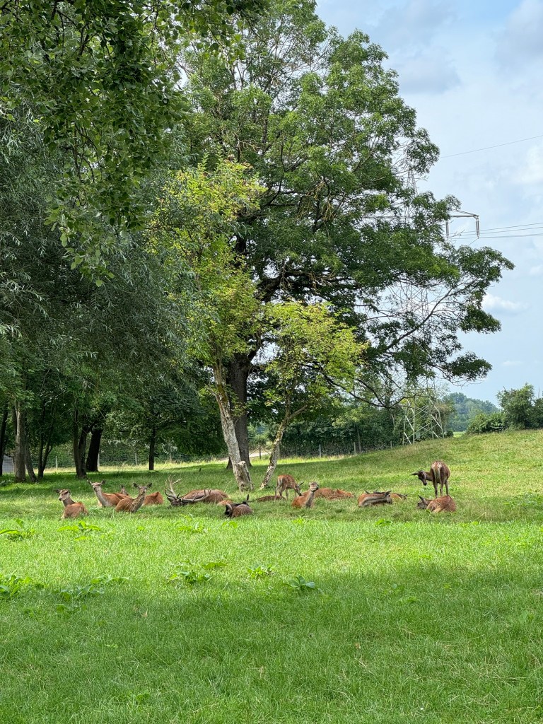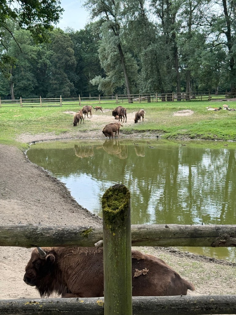 Ved totiden gik alle på nær Mark op til en wildpark med bisoner og kronvildt . Det var fint at få det med.