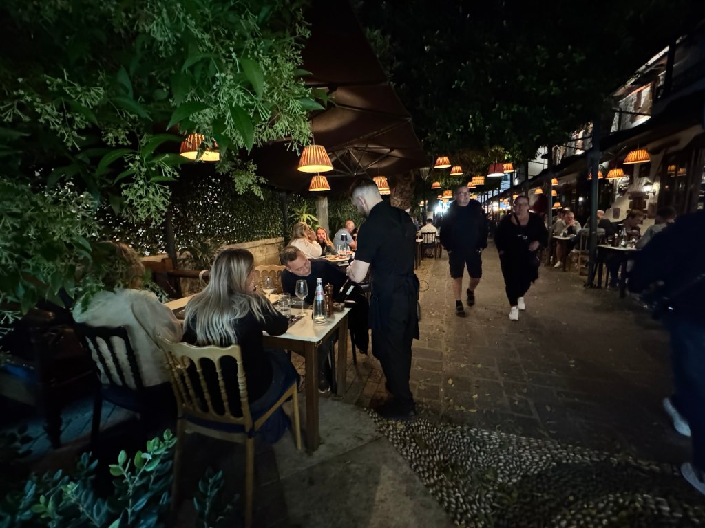 Min kollega Julie har anbefalet flere steder hernede. Hun er godt med en mad fra Rhodos så vi fandt den restaurant hun anbefalede – meget hyggeligt sted med lamper overalt hvor man sad udendørs .