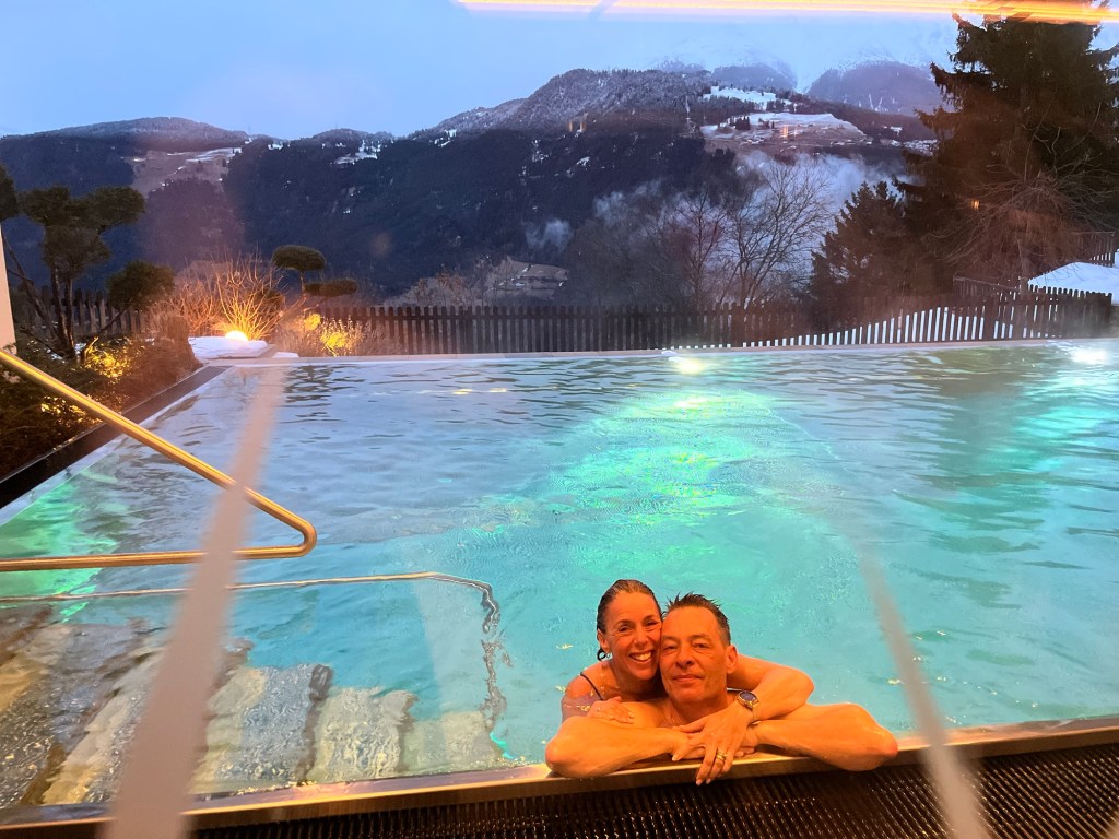Så var vi klar til lidt afslapning i poolen – en udendørs infinity opvarmet pool med lækkert afslapningsområde .