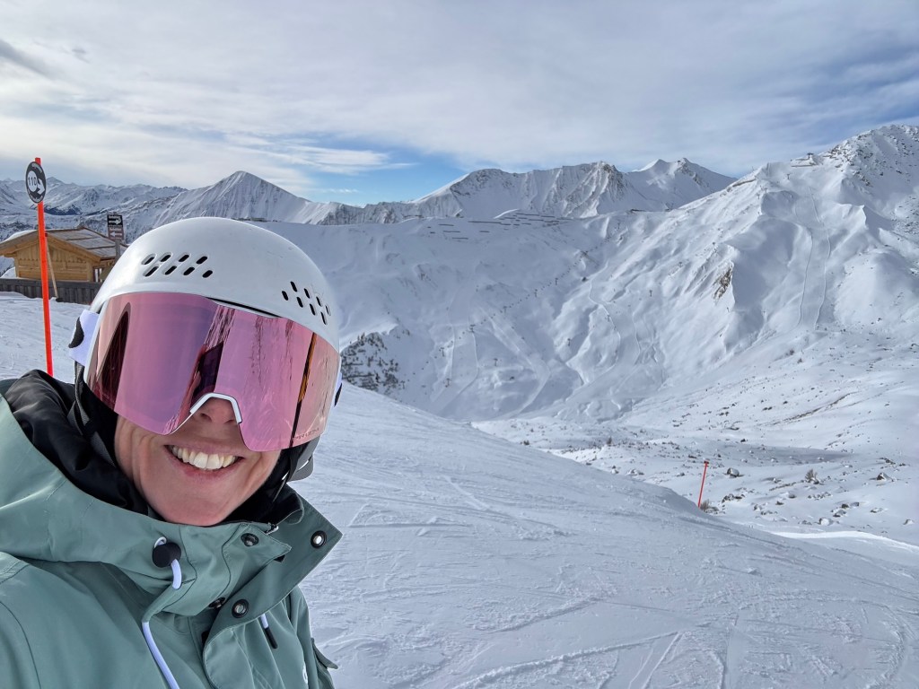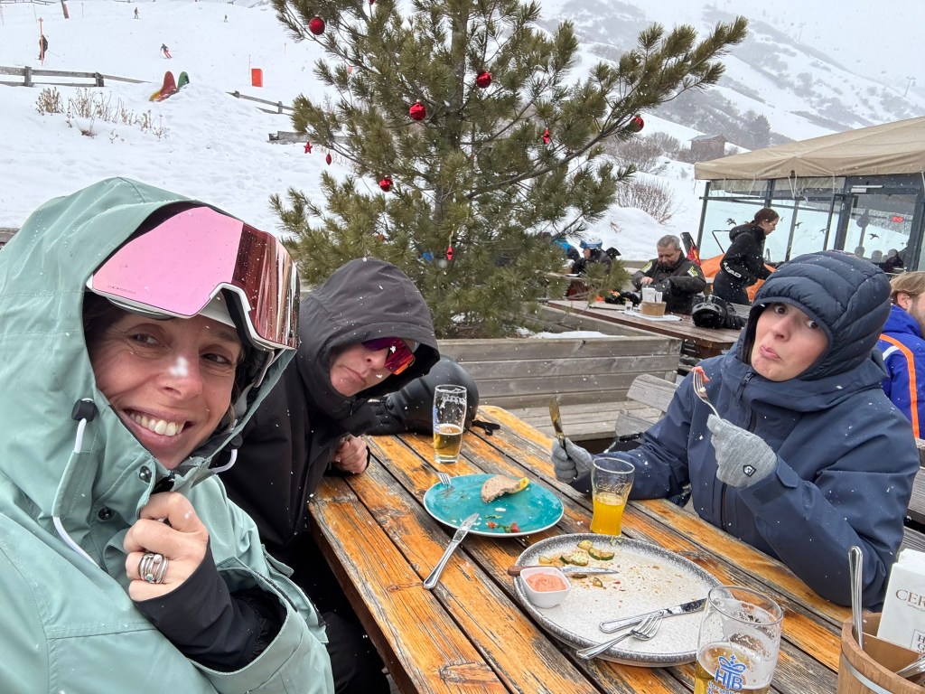I dag kom der pludselig en masse sne ved frokosten og hjemturen blev strabadserende: tung og våd nysne der lagde sig som en dyne også på vores goggles og ingen sigtbarhed. Man kan ikke fornemme hvad der går op eller ned. Jeg har forstrukket et eller andet i lysken – det kunne jeg mærke, da jeg kom hjem og ikke kunne løfte benet.